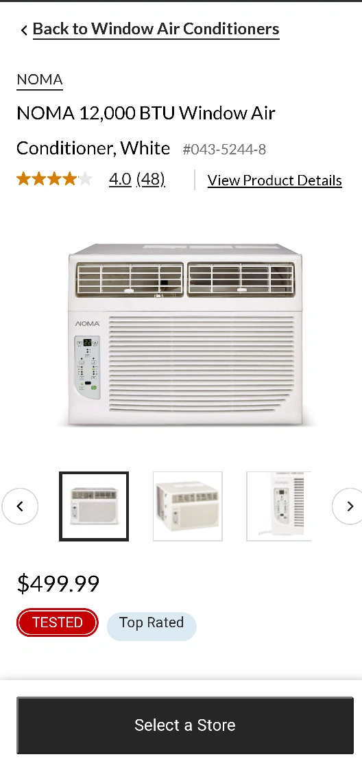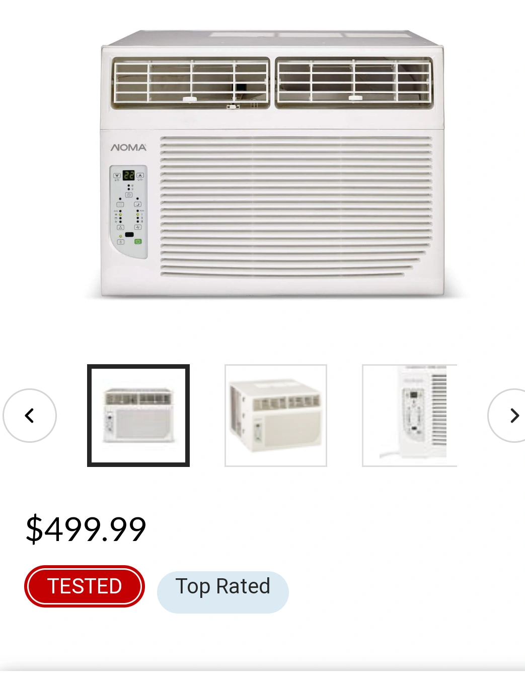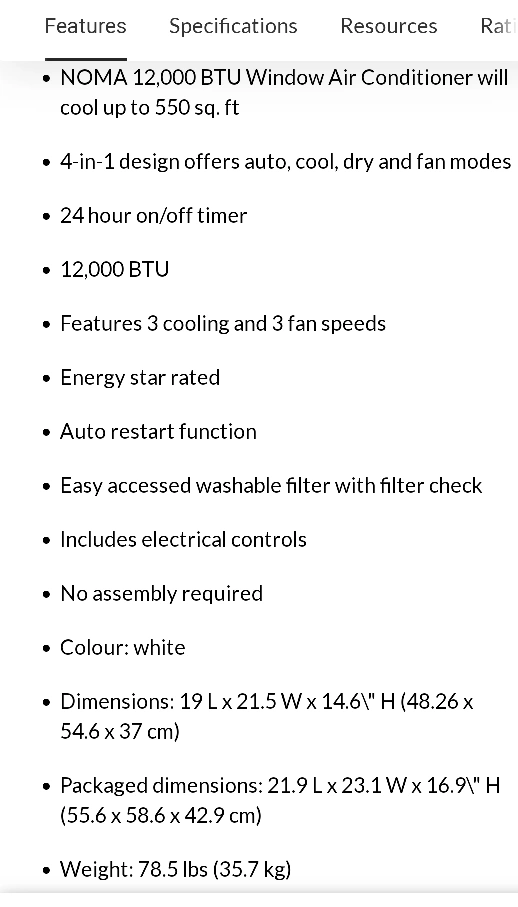 Currently TOP RATED and priced at $500 plus taxes at Canadian Tire, etc. NOMA 12,000 BTU Window Air Conditioner will cool up to 550 sq. ft 4-in-1 design offers auto, cool, dry and fan modes 24 hour on/off timer 12,000 BTU Features 3 cooling and 3 fan speeds Energy star rated Auto restart function Easy accessed washable filter with filter check Includes electrical controls No assembly required Colour: white Dimensions: 19 L x 21.5 W x 14.6\" H (48.26 x 54.6 x 37 cm) Weight: 78.5 lbs (35.7 kg)