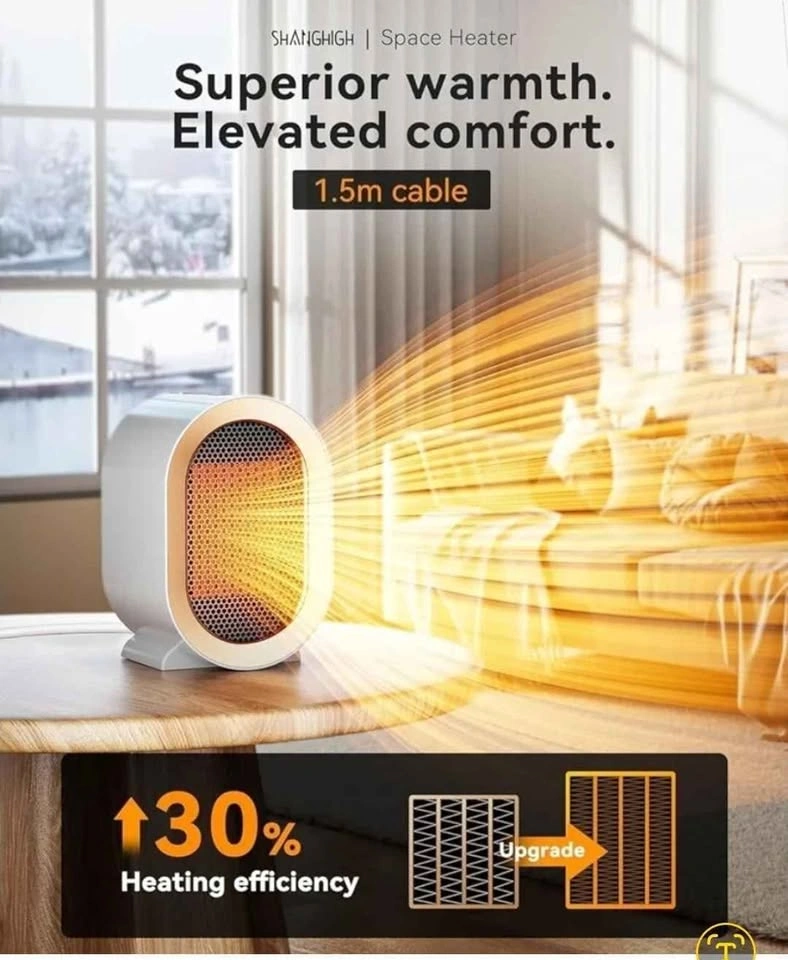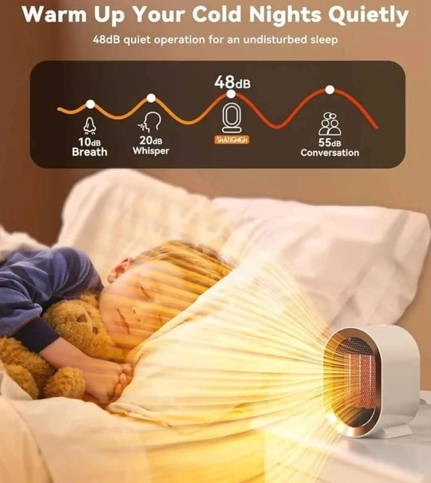 HIGH EFFICIENCY heater. 1200W portable space heater has two different heating settings (low and high), three second heating, and more uniform heat distribution. You don't have to waste a lot of money on central heating. It heats up day and night, avoiding any fire hazard, and protecting the safety of your family. The noise emitted by QQT portable heaters for indoor use is less than 30 decibels. The purpose of this portable heater is to place your feet on the floor, put your hands close to the table, or carry it indoors quietly enough for most people to use when sleeping in the bedroom. The cold winter will not affect your work and life at all, and you can sleep or work at ease. 8.2 "* 5.9" * 5.5 " personal heater adopts compact shape design, which is very suitable for use in various places.