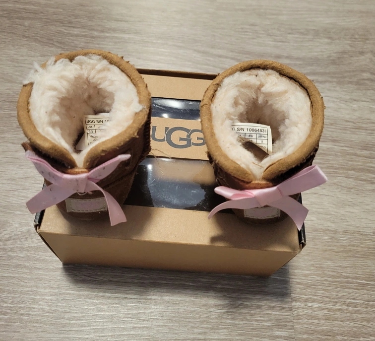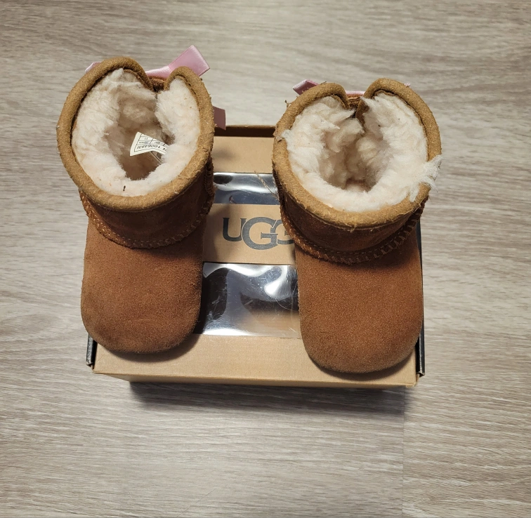 Beautiful UGG with a pink cute bow at the back. very warm and not made to wear with a thick socks. It's size 2/3 US which fits up to 6 months. Please reach out only if interested.