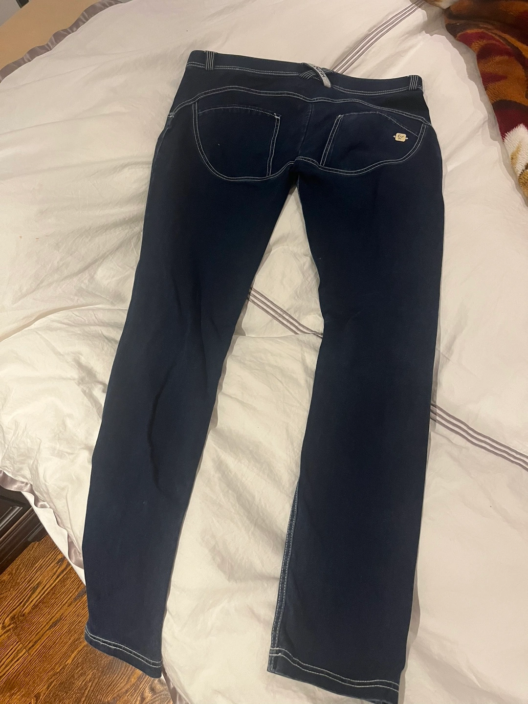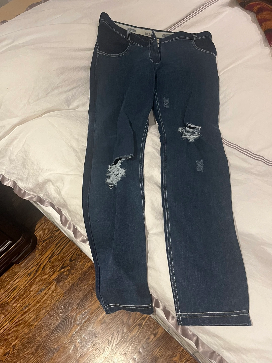 Great jeans and rarely worn. They are ripped in the front and more like jeggings , so they are super stretchy and comfortable. Dark blue with white piping. They make a cute bootie. Paid $ 229 originally. Size L or 30.