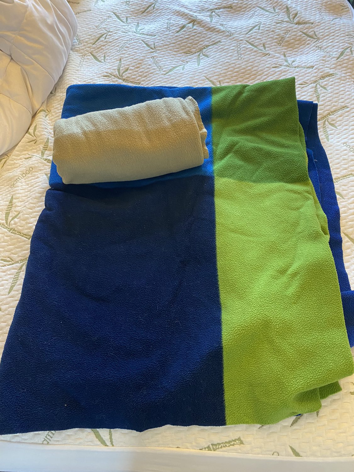 Two cozy couch blankets, one is big and blue/green, one is smaller and beige. Will wash first!