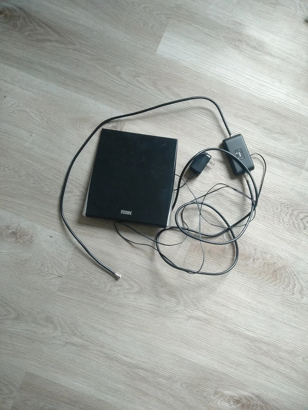 Terk TV antenna/satellite. It can pick up HD channels. Requires just a regular two prong plug and cable port. Model#: OMNITV1A.