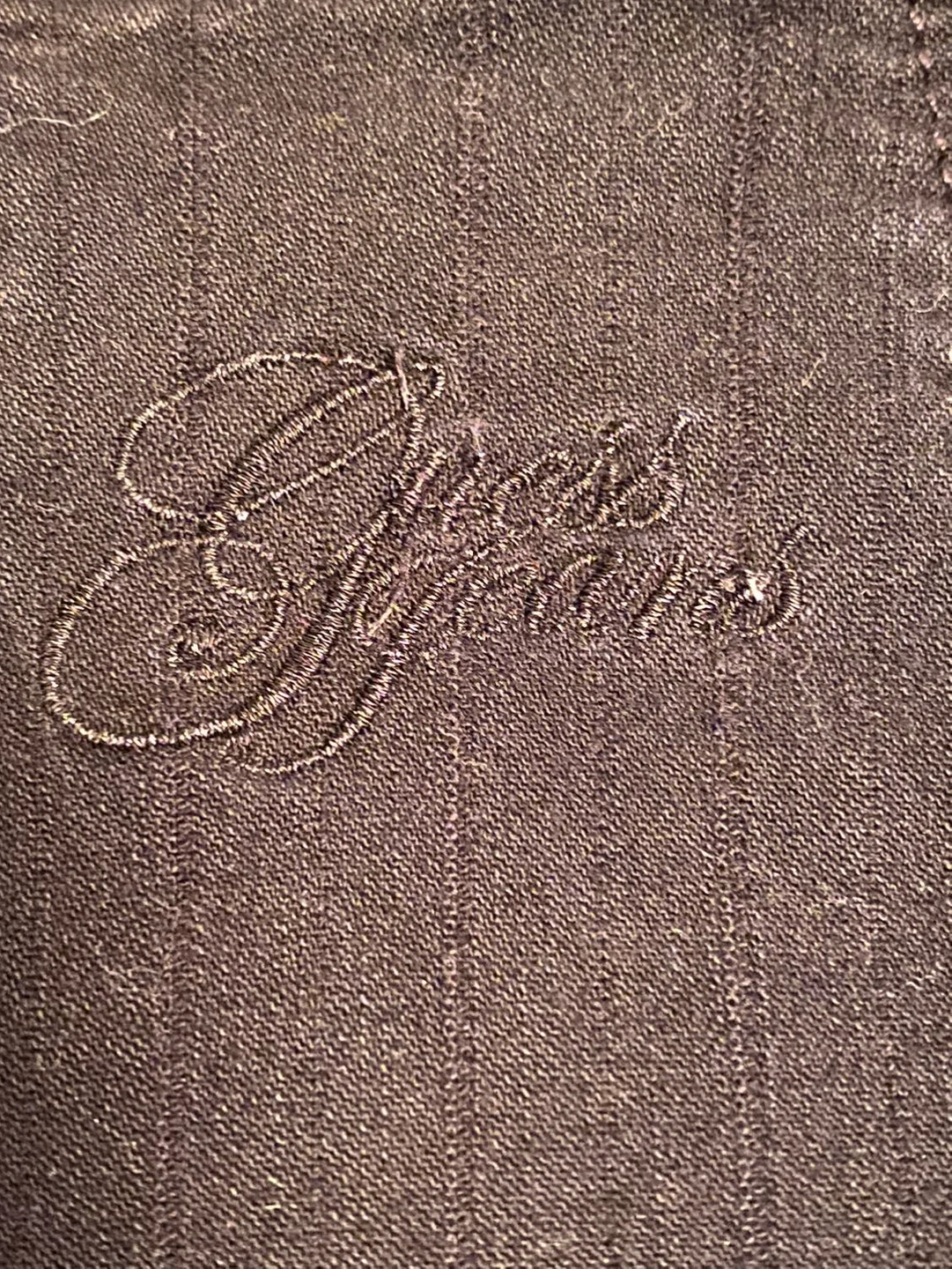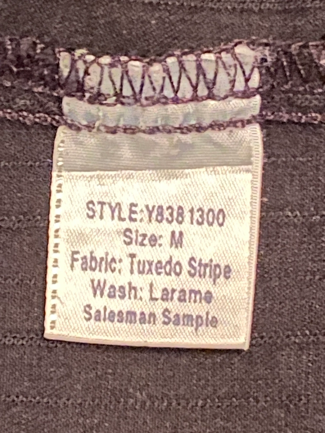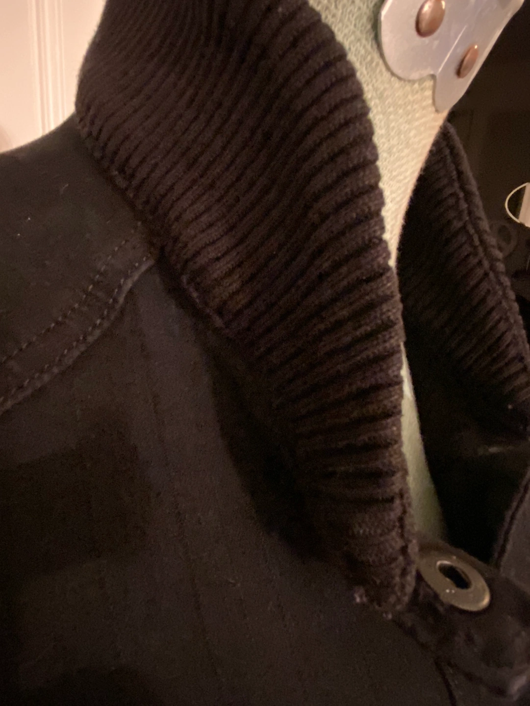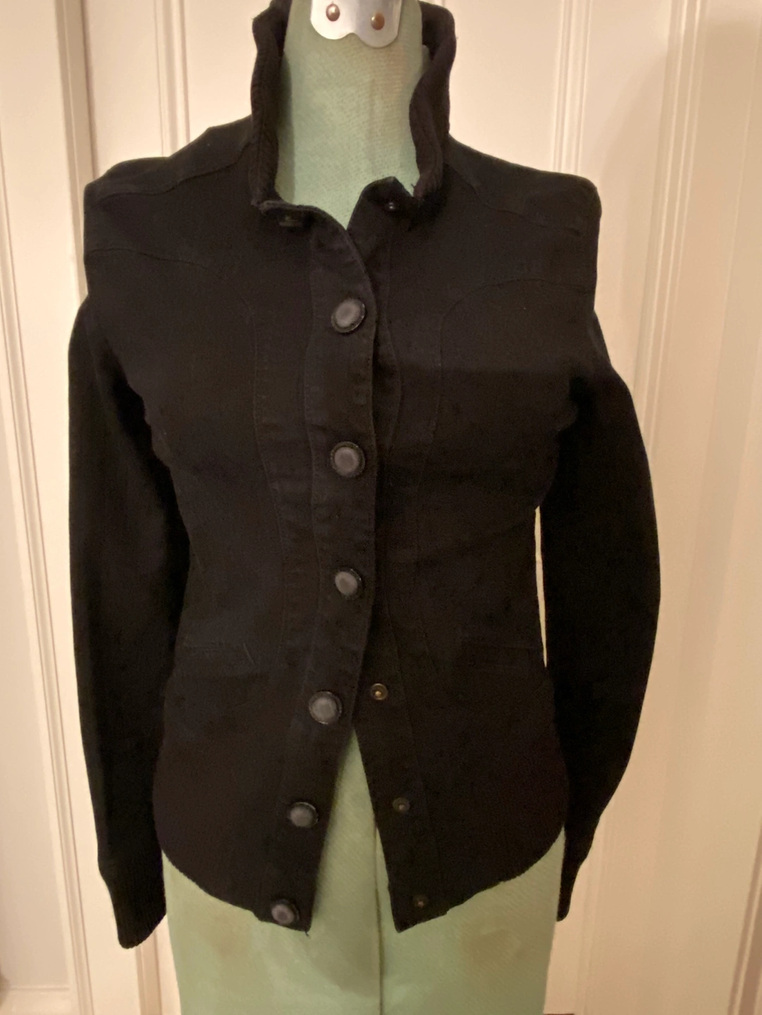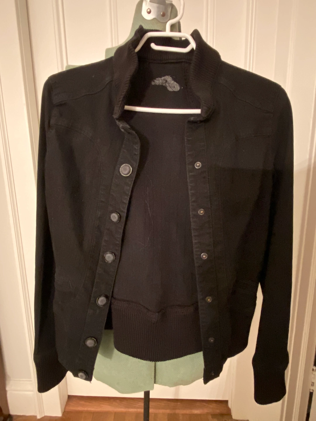 Black stretch denim Ribbed collar, cuffs, waist Snap buttons with logo Sales sample
