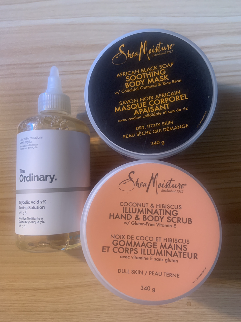$8 each or $20 for all three. Shea Moisture (340g each) 1) body mask with African Black Soap, Colloidal Oatmeal and Rice Bran 2) illuminating hand and body scrub with Coconut, Hibiscus and Gluten Free Vitamin E The Ordinary 3) Glycolic Acid 7% Toning Solution, 240 ml