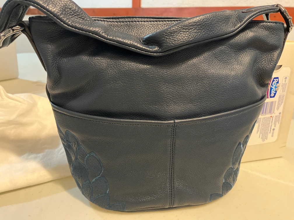 Leather dark blue top zip closure with tassels, embroidered with leaves. One zip pocket for security and two pockets inside. Two pockets outside of the bag. Helping an elderly woman to sell her stuff to support her financial needs. From pet and smoke free house. Pick up only. Exact cash only please. Thanks a lot ๐ You might be interested to my other listings ๐