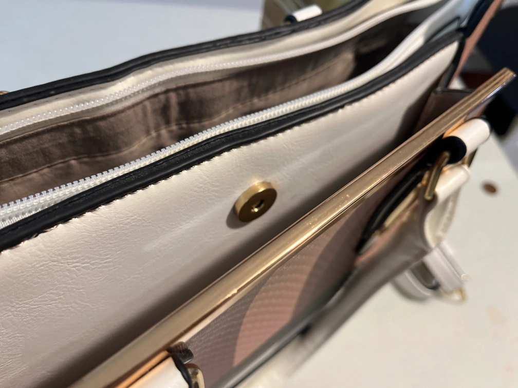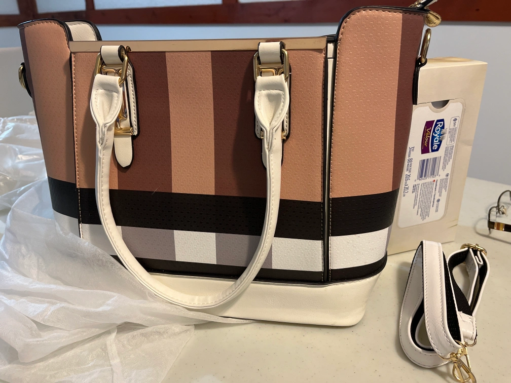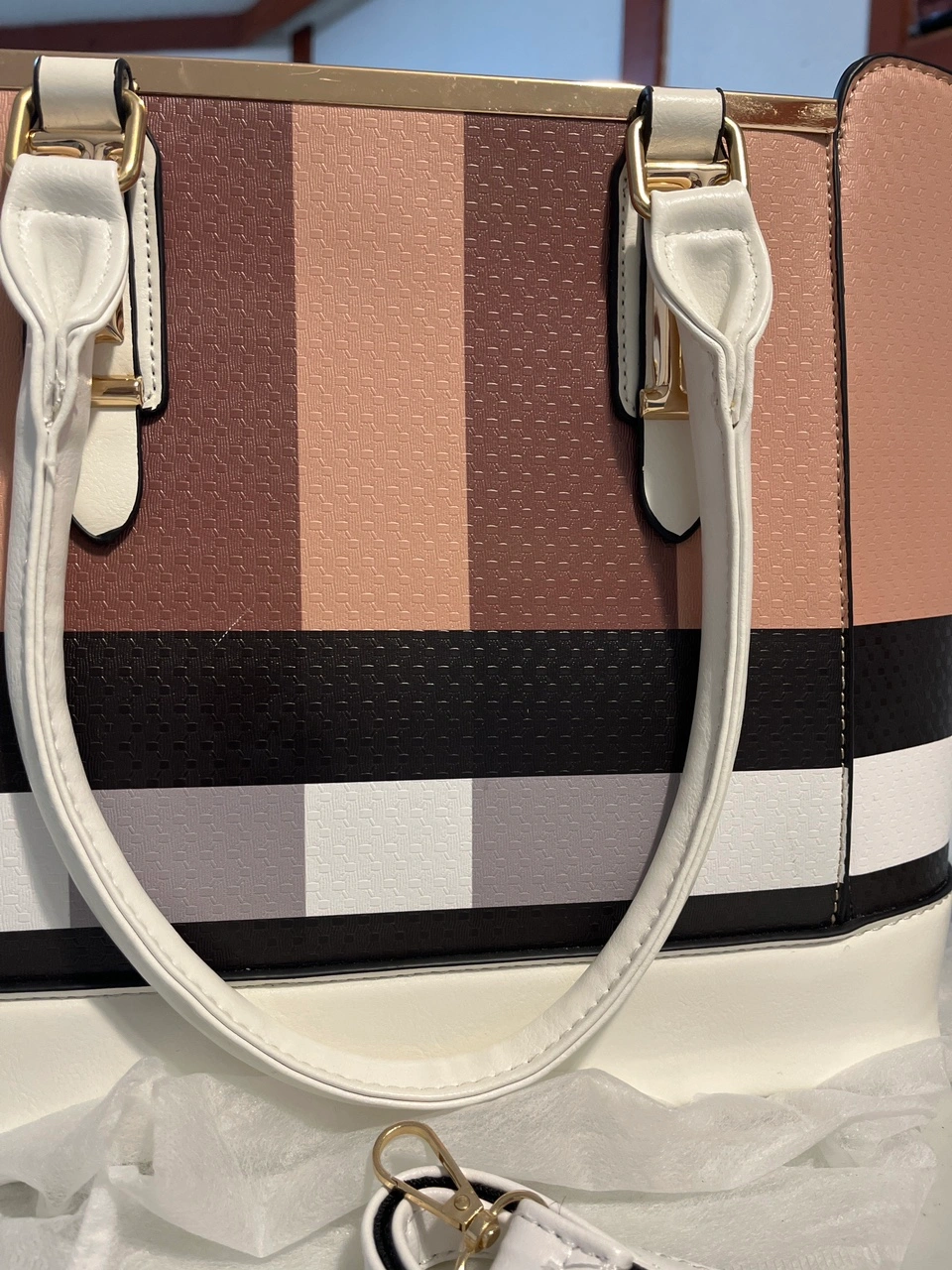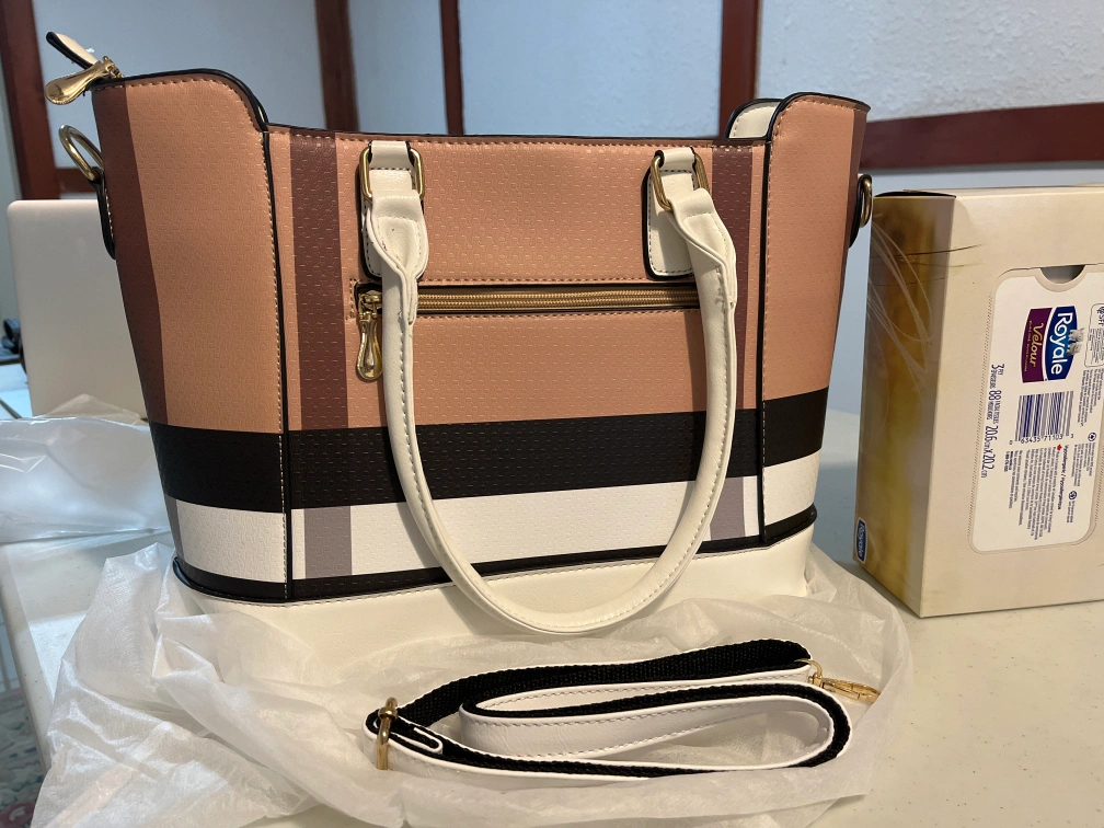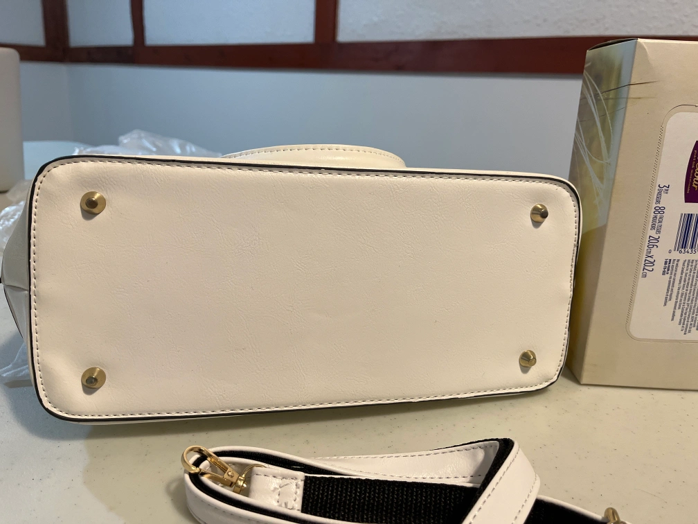 Beautiful leather bag with shoulder strap. One magnetic closure pocket and one zip pocket outside and one inside. Two more pockets inside for Celphone, etc.. Im just helping an elderly woman to sell her stuff to support her financial needs.