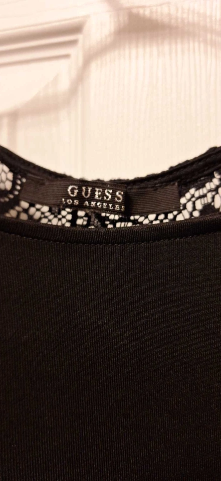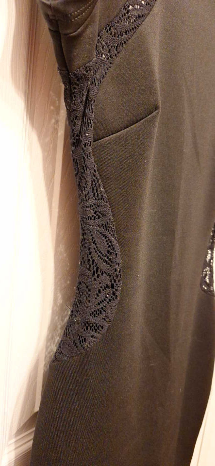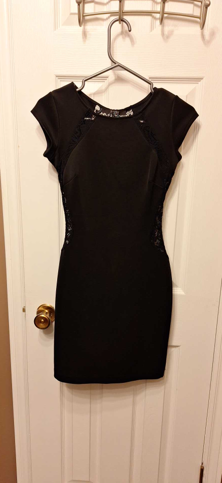 it is size xs black with lacy design going up the sides to the back as seen in photos. tight flattering fit! this dress is the PERFECT little black dress for an elegant night out. above the knee but not too short.