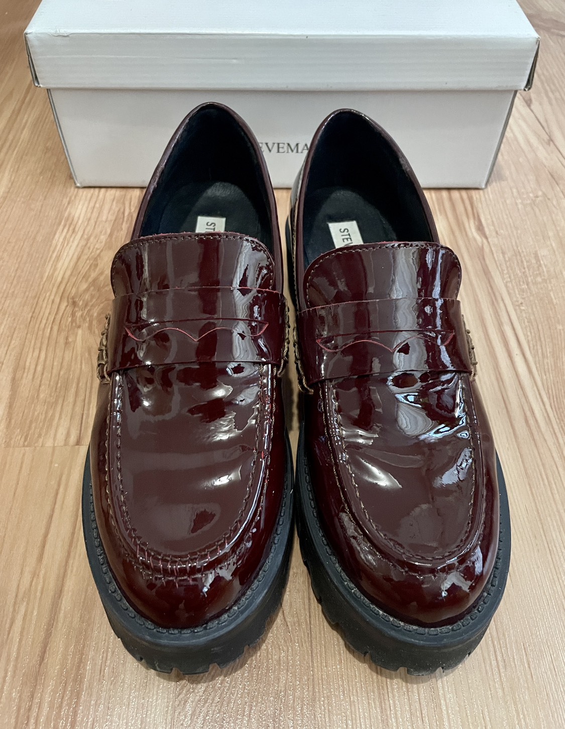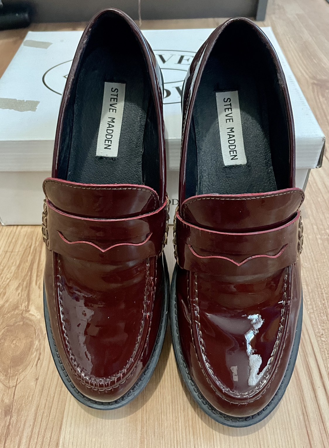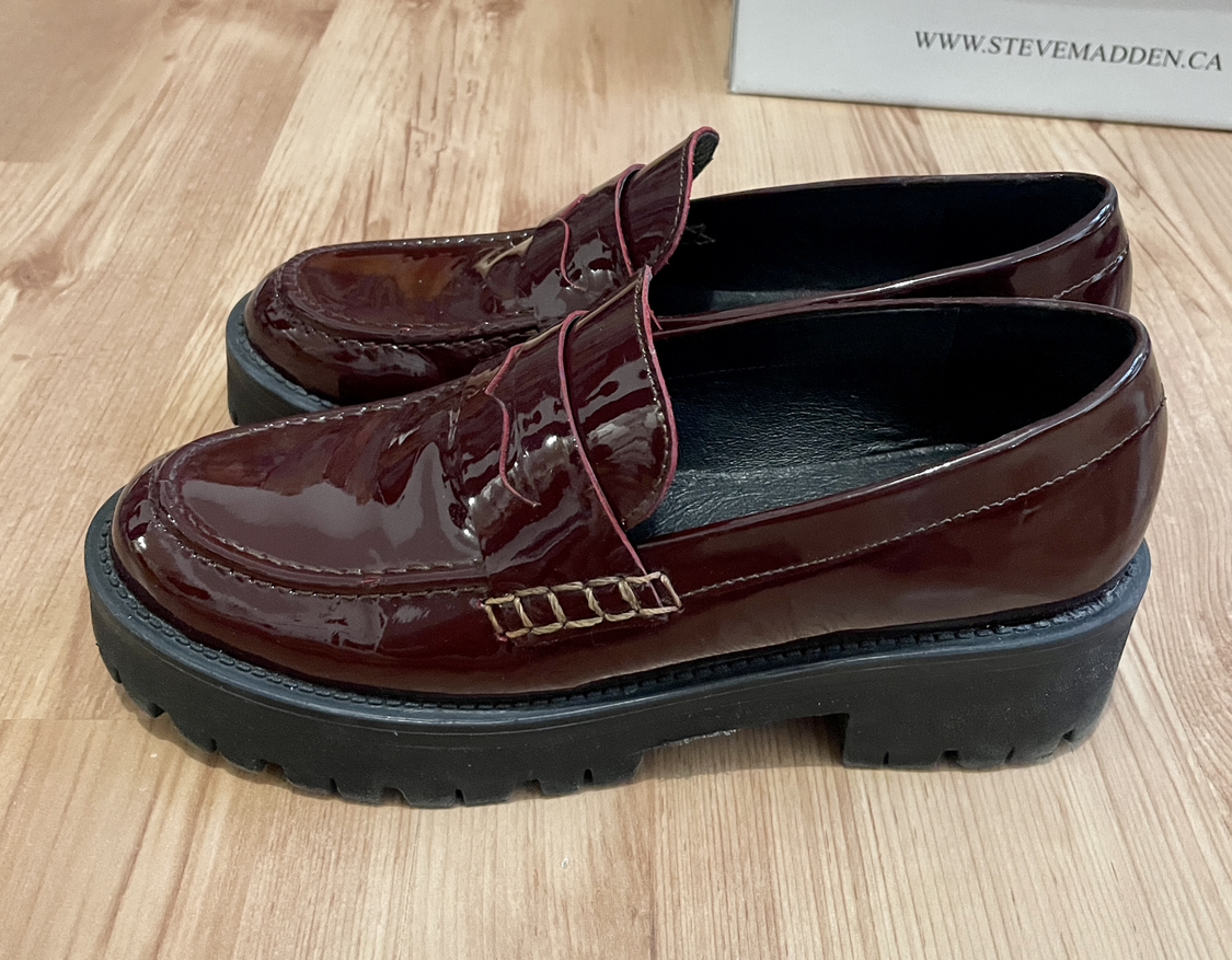 leather upper / synthetic lining / rubber sole im 6.5 but it fits great (i think their sizing seem different) i wore 3-4 times, it’s in mint condition! cute burgundy loafer