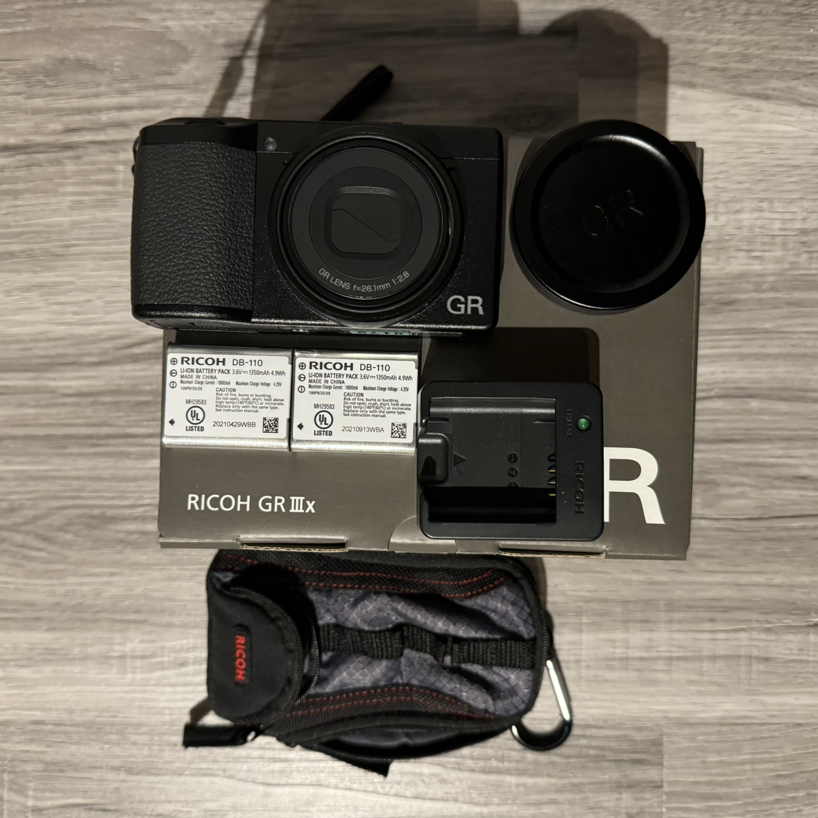 Ricoh GR IIIx camera with several accessories. Perfect condition. Totally babied and always kept in lint-free (microfibre or ripstop) enclosures with the lens cap on. Gorgeous image quality and very lowkey. Included: - Original camera body. (Of course.) - Original packaging, cables, and battery. - Extra official Ricoh battery (DB-110). - Official Ricoh USB-C battery charger (BJ-11). Safer and more portable than the off-brand ones. - Official Ricoh adventure case with carabiner and spare battery pocket. Meant for a different series but fits great. - Off-brand metal lens cap. It has a couple nicks because sometimes I forget it's on the camera when I turn it on and it falls. Total after-tax value of over $1700. Alternate spellings: GRIIIx, GR 3x, GR3x. RFS: Thought I wanted to get into street photography. Got into event photography instead. It's an incredible camera and the one to finally make photography stick for me and level up my skills, but I just don't reach for it any more. Please feel free to check out my other posts (current and future). Happy to offer discounts for bundle sales.