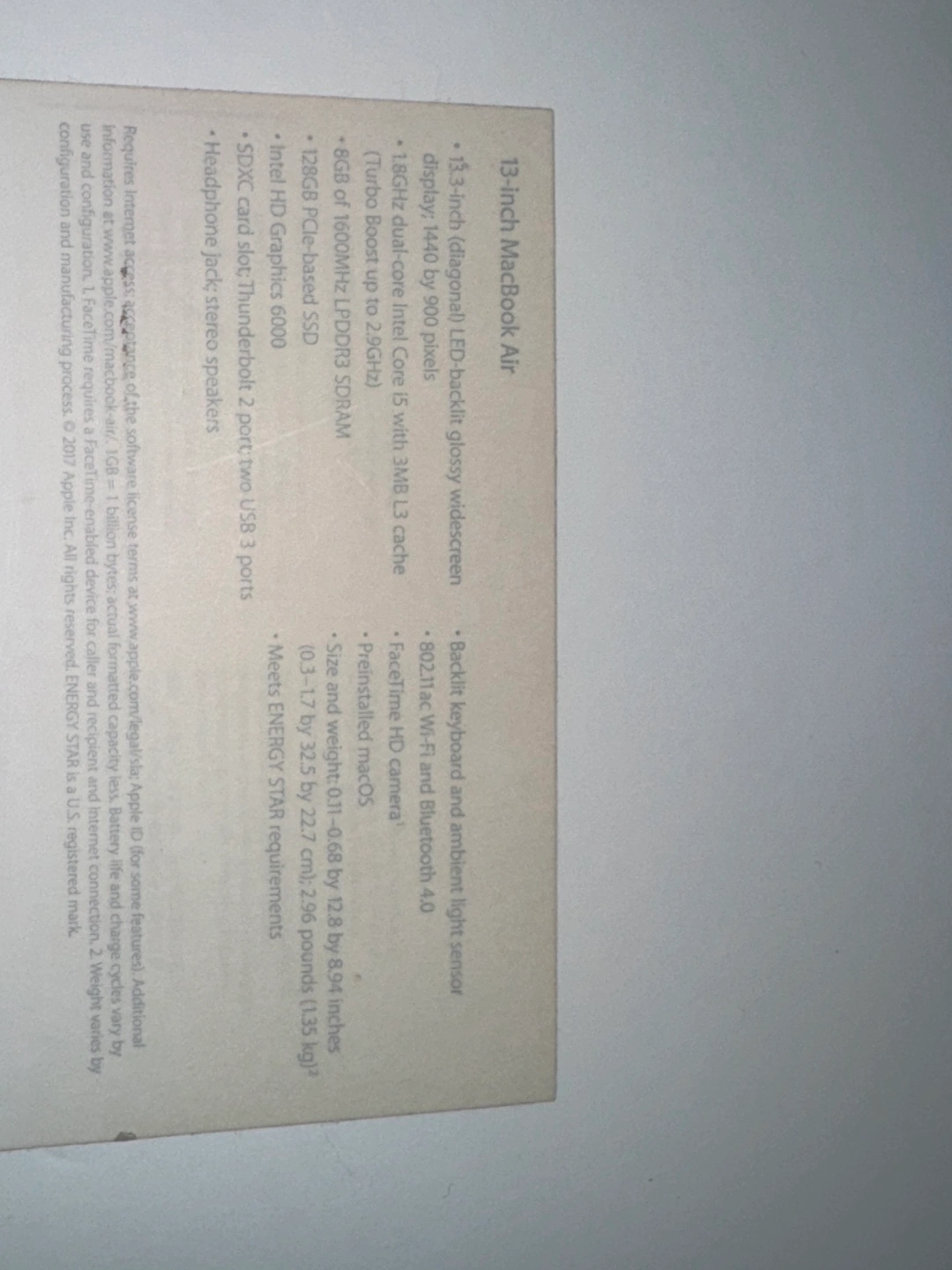 Used MacBook Air, 13-inch screen. Features 8GB of RAM and 128GB of storage. Backlit keyboard and ambient light sensor. Includes two USB 3 ports. Preinstalled macOS. It does have stickers on the front of the laptop This was my laptop when I was a teenager, still used it time to time it’s in good condition and works perfectly.