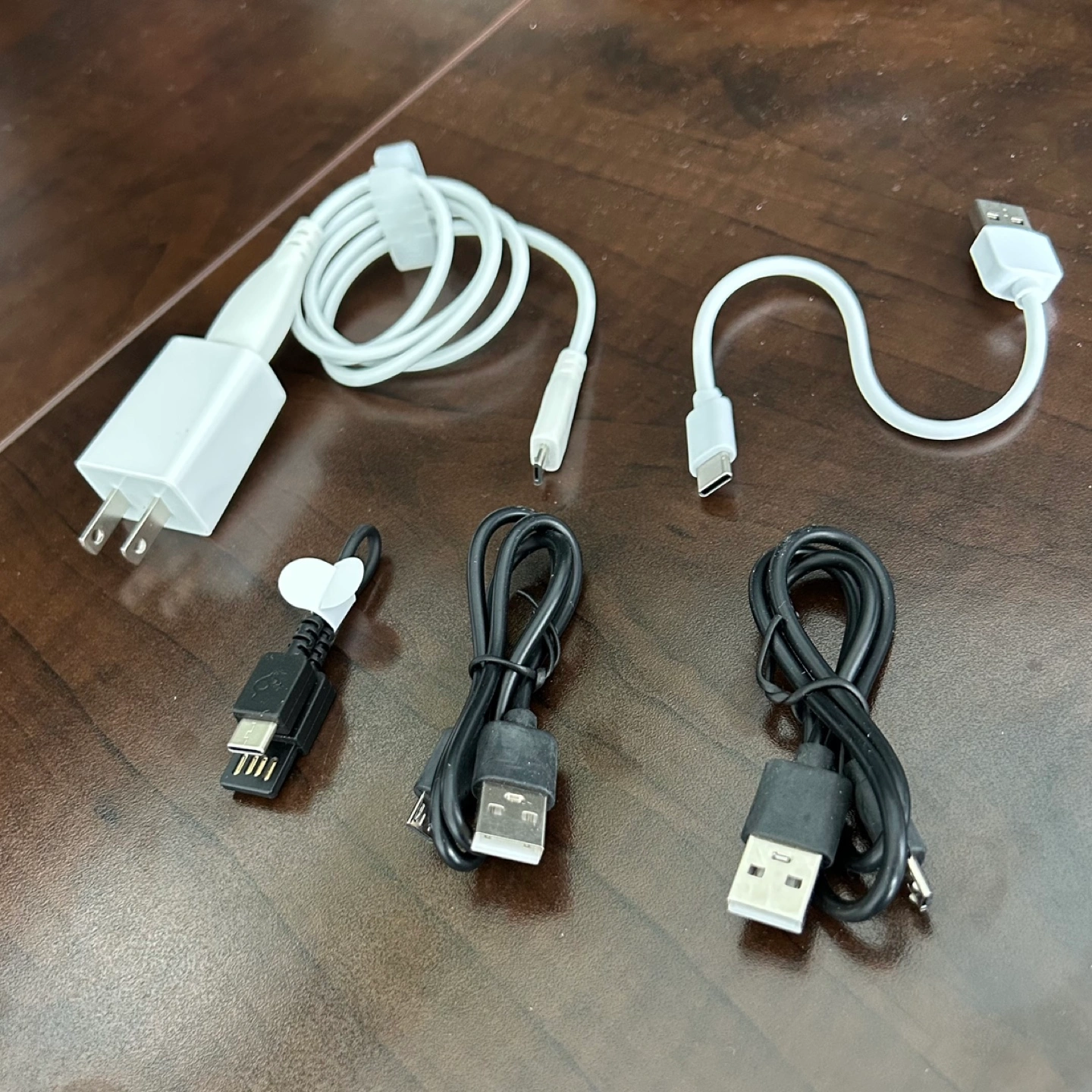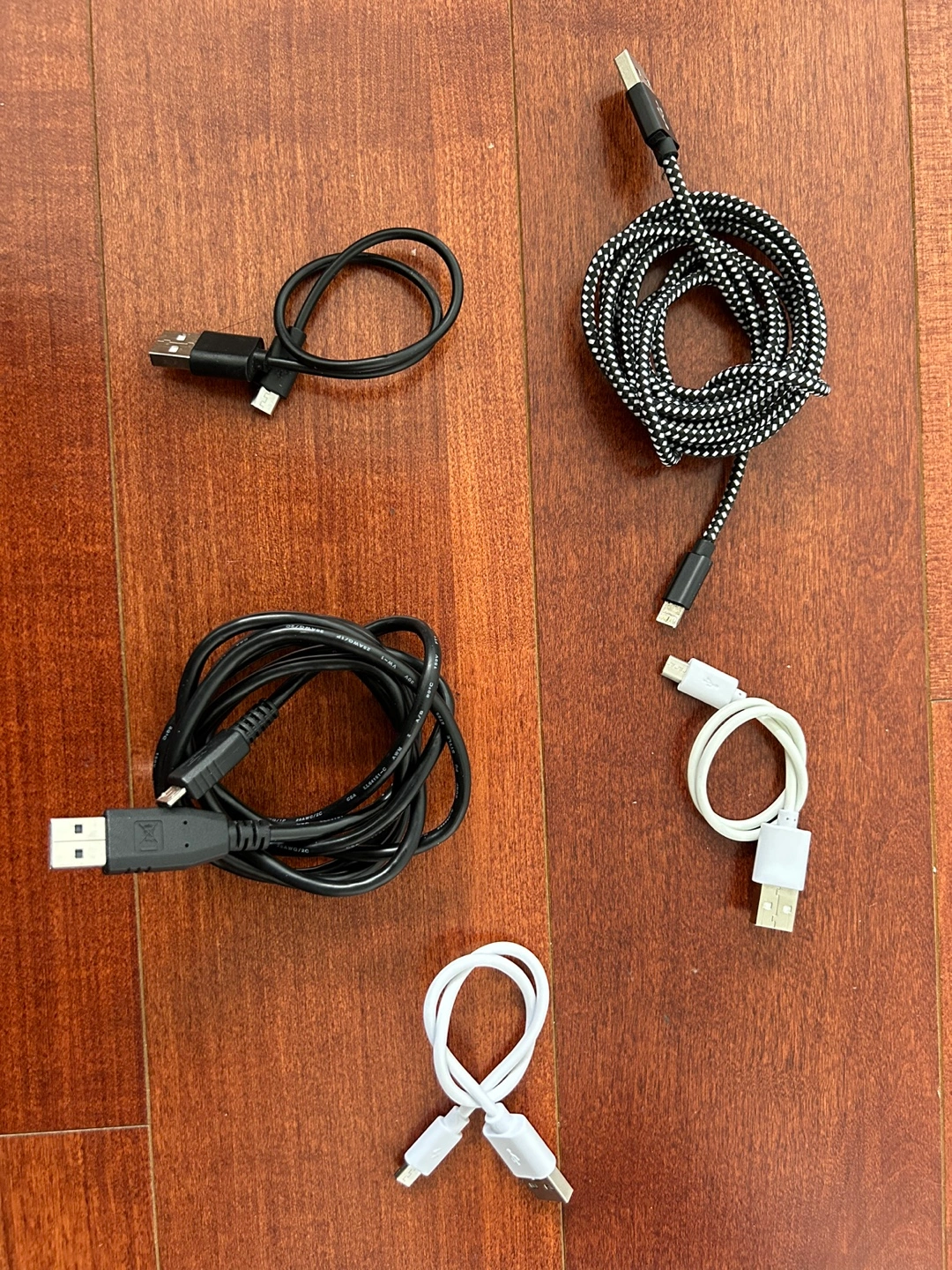 USB-A to USB-C (2 short ones in black or white) - $3 each USB-A to Micro-B (4 short in black or white) - $3 each USB-A to Micro-B (long)- $5 Long threaded USB-A to Lightening - $5 Pickup at Burnhamthorpe and East Mall