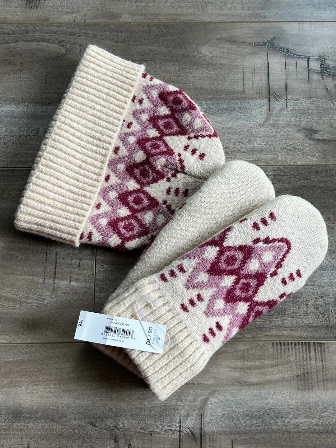 Never worn- tags still attached. Beanie and mitts- fleece lined Gorgeous cream and. Plum color. Paid $34 + tax originally