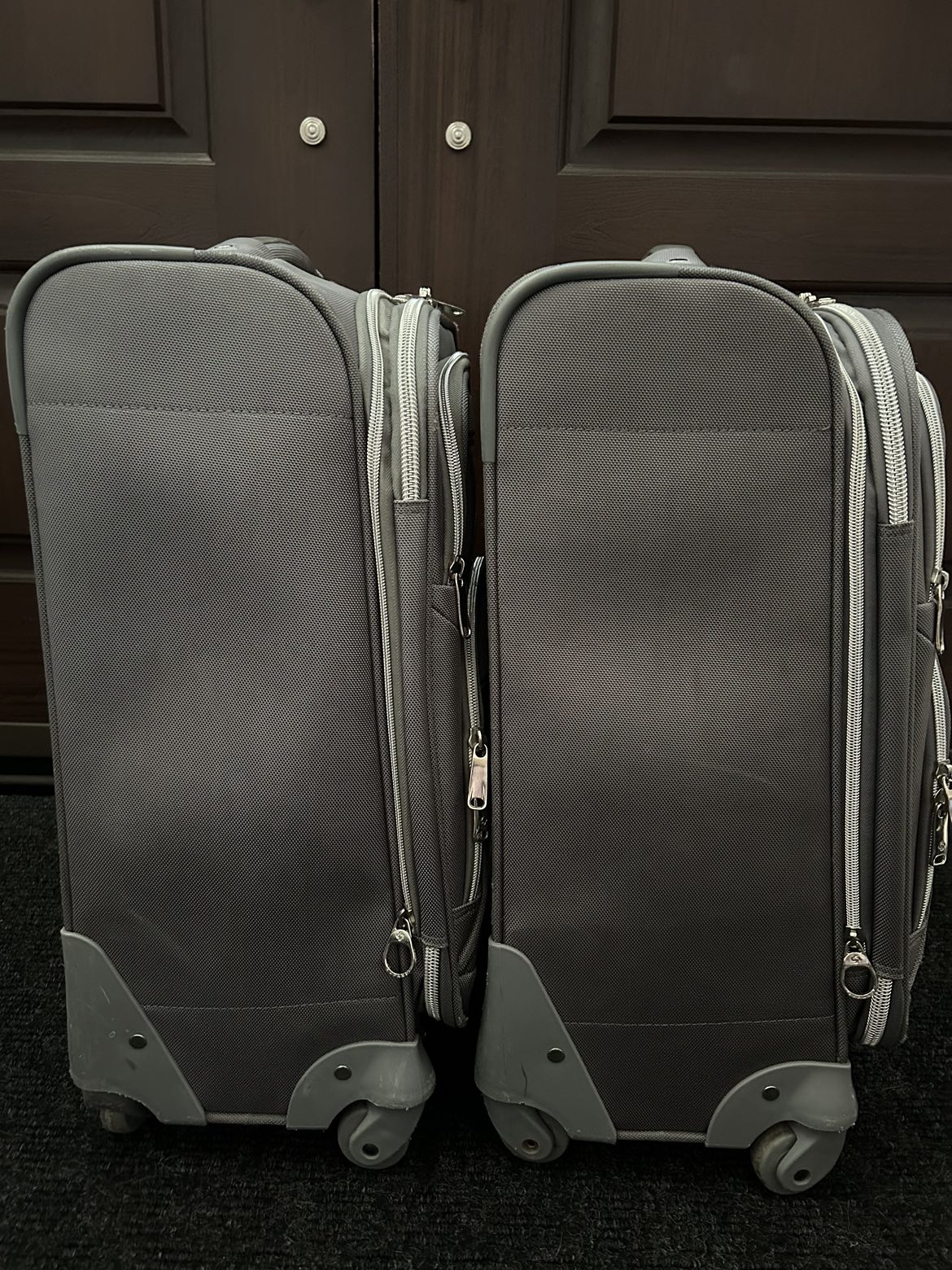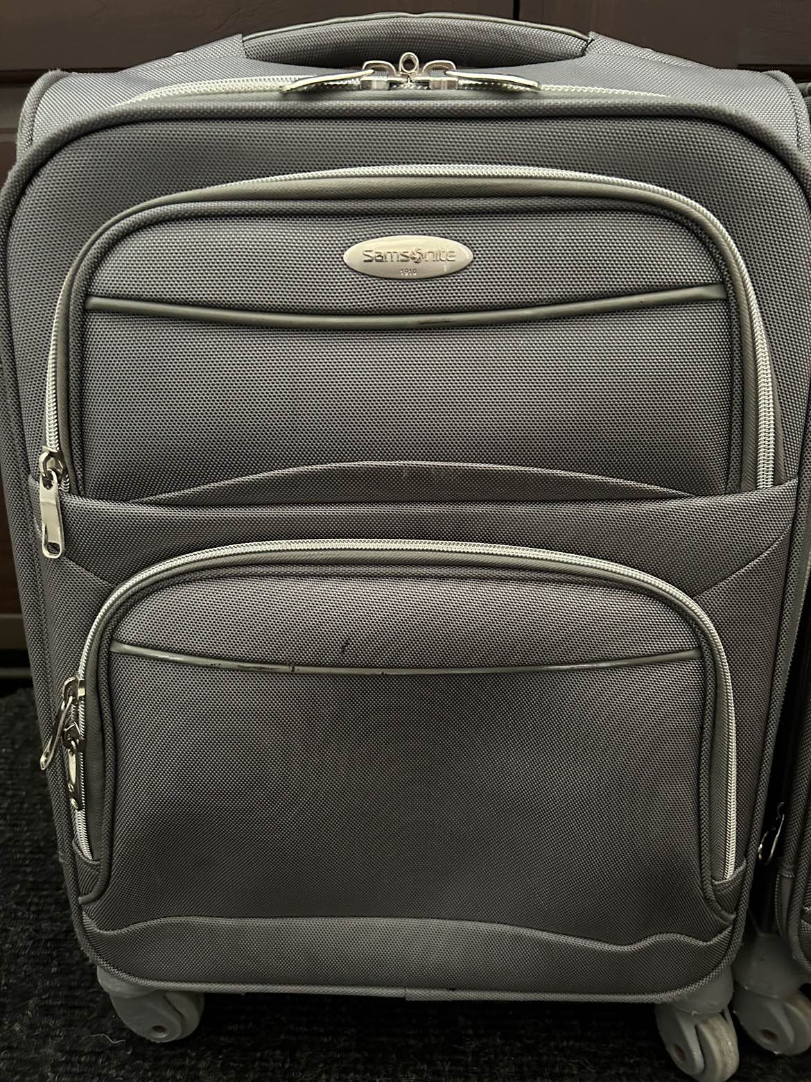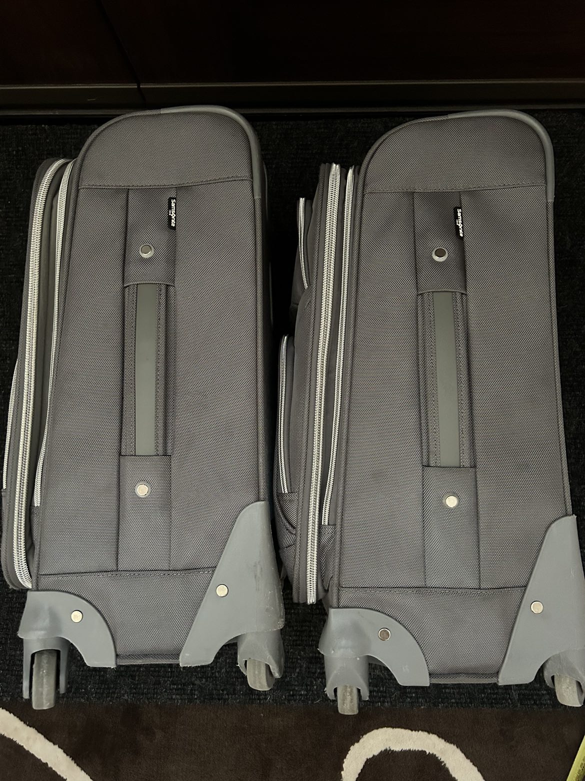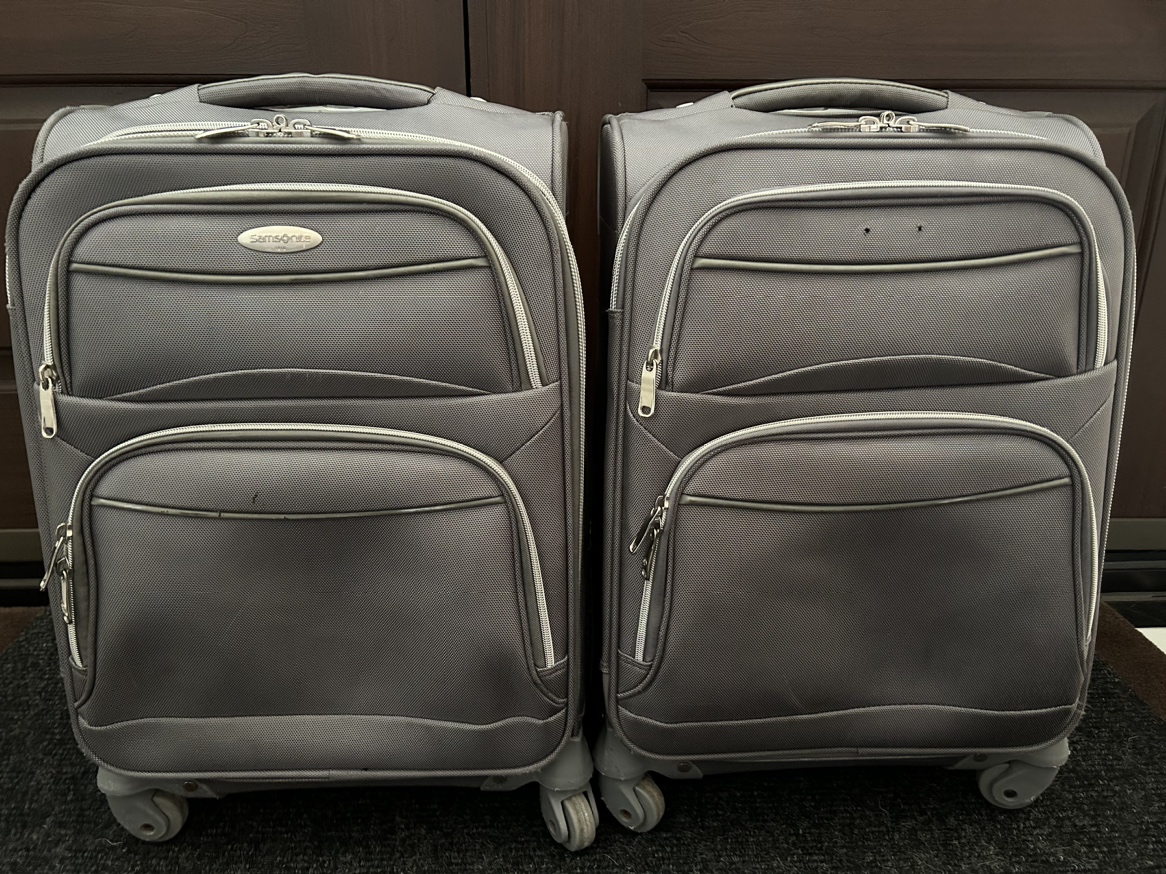 Samsonite spinner 4 wheel luggage in silver gray color in good used condition with one of suitcases missing Samsonite logo on front. All zippers are functional. Dimensions are are 22” x 15.5” x 9.5”. This is slightly larger than most airline Canadian airline carry on sizes so make sure you check measurements. One for $15 or $25 for both.