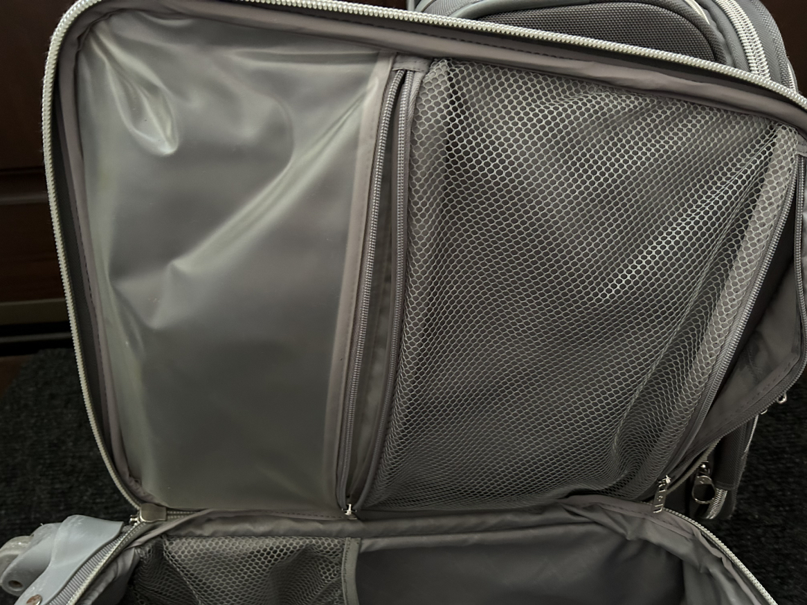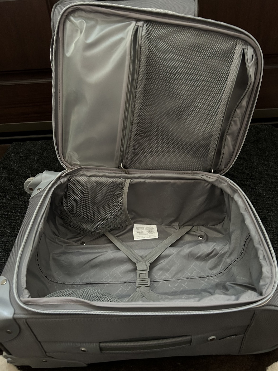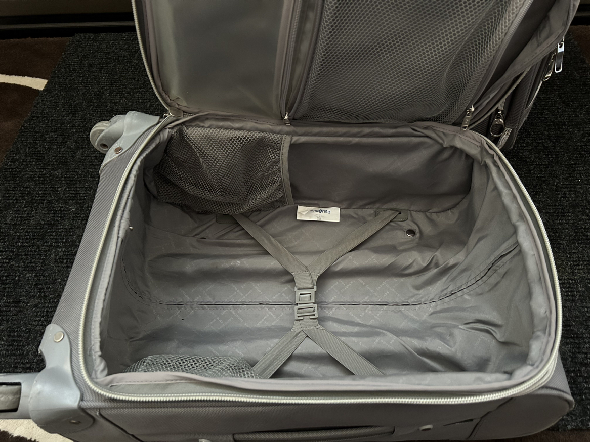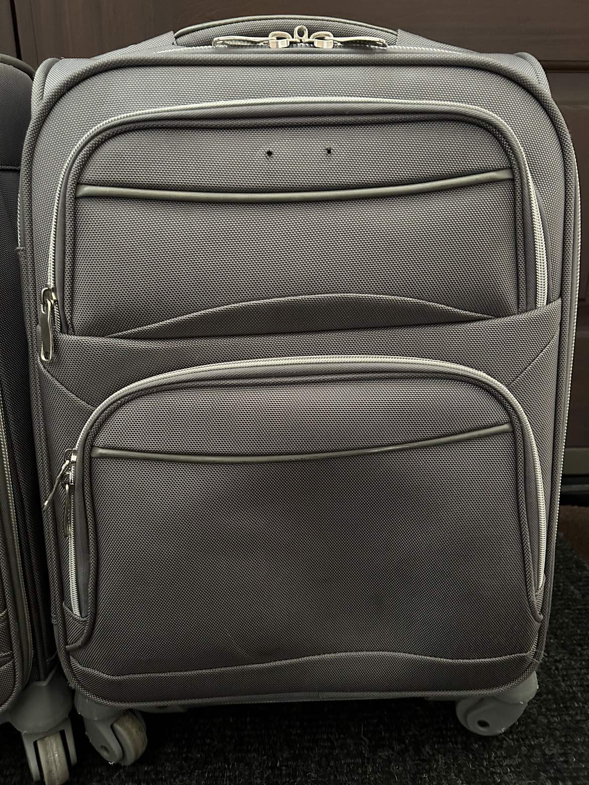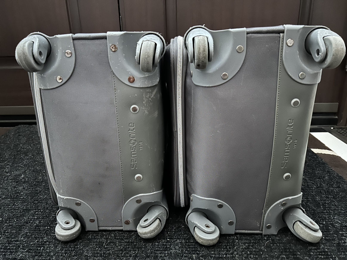 Samsonite spinner 4 wheel luggage in silver gray color in good used condition with one of suitcases missing Samsonite logo on front. All zippers are functional. Dimensions are are 22” x 15.5” x 9.5”. This is slightly larger than most airline Canadian airline carry on sizes so make sure you check measurements. One for $15 or $25 for both.