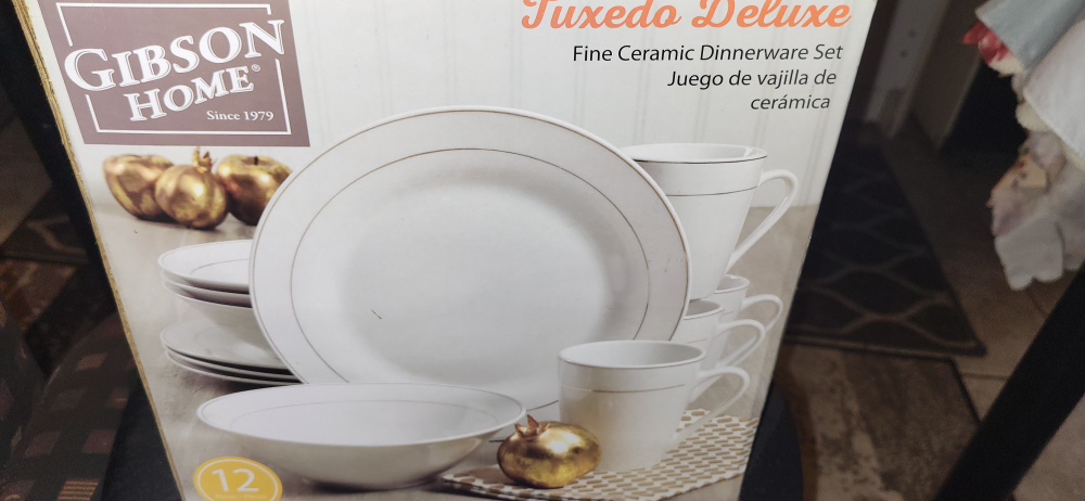 Brand new dinnerware set comes with 4 9in dinner plates, 4 7in bowls, and 4 9oz mugs/cups. Has silver/gold design on all pieces 1 for $30 2 for $50