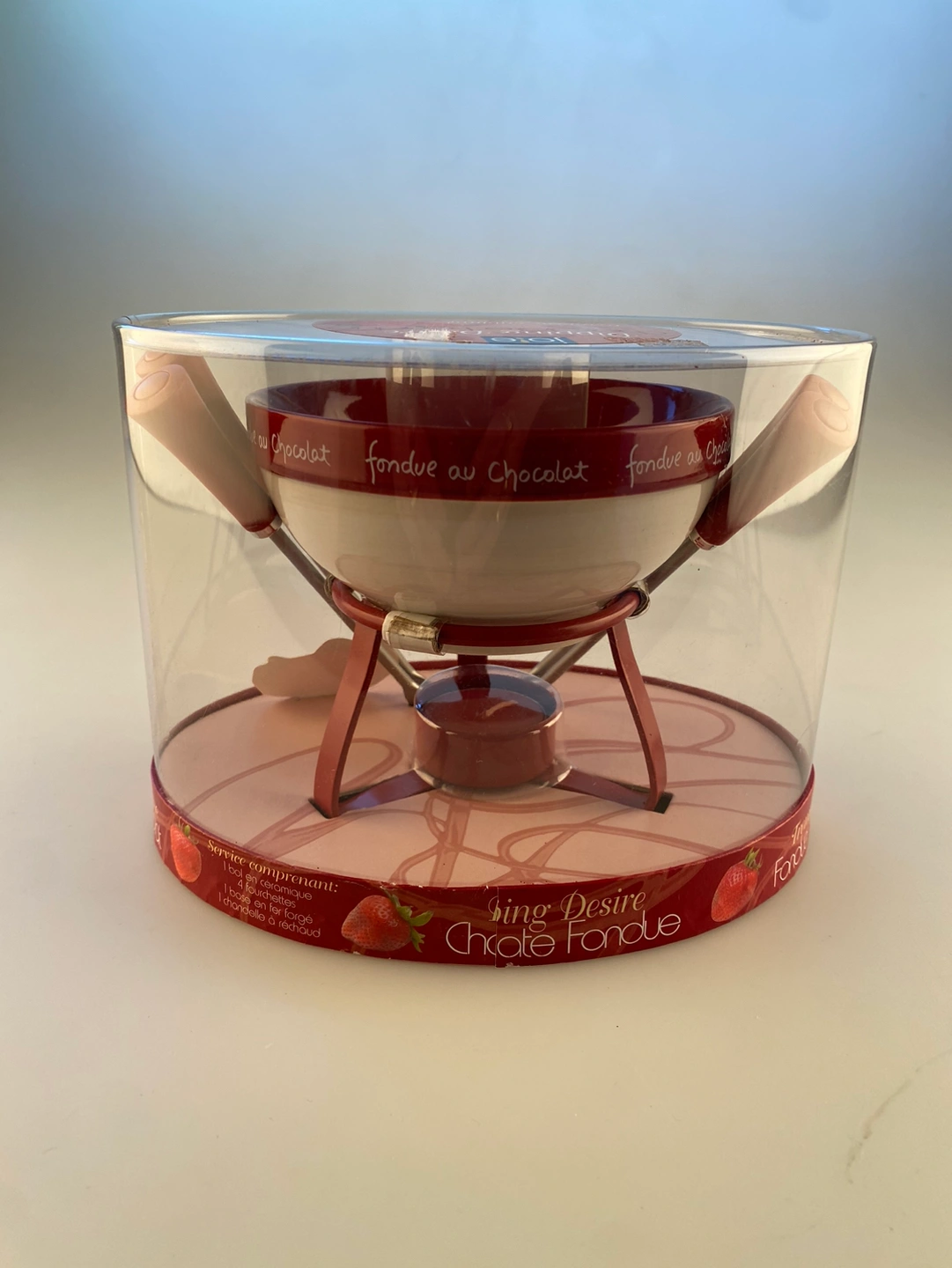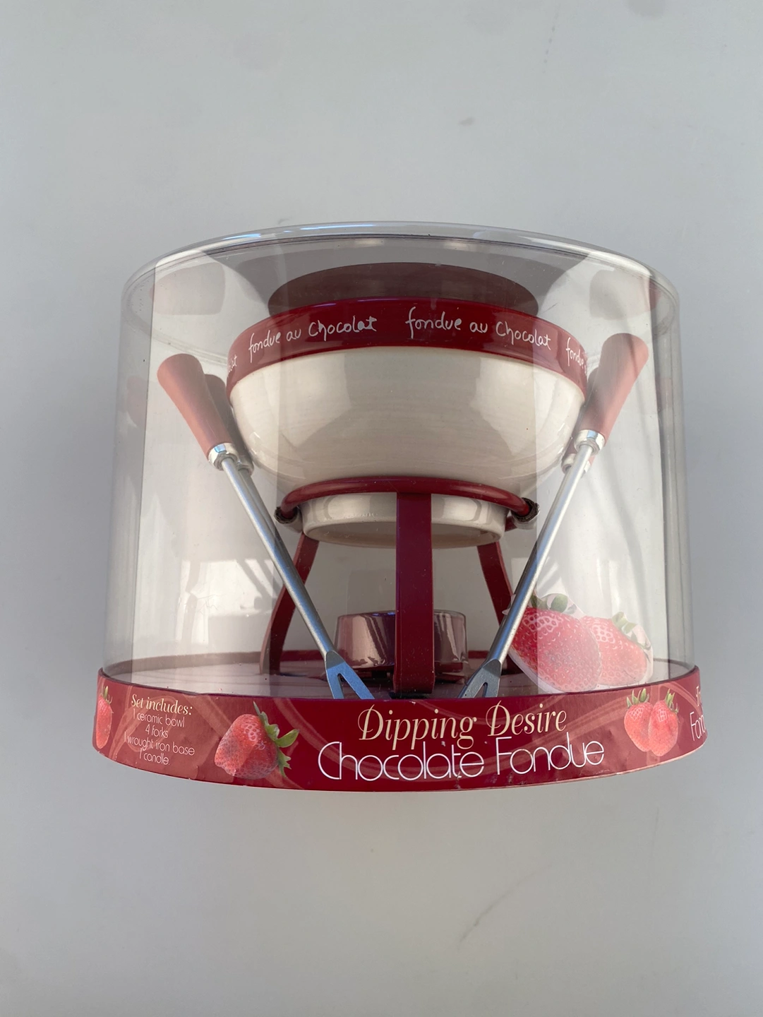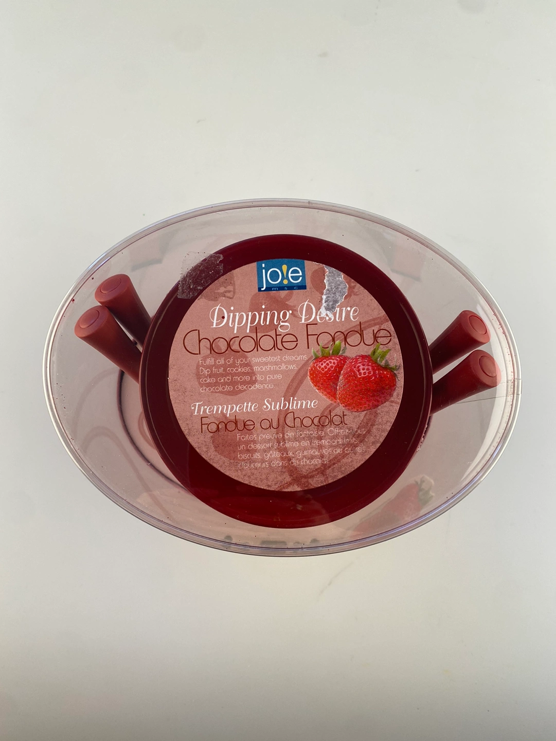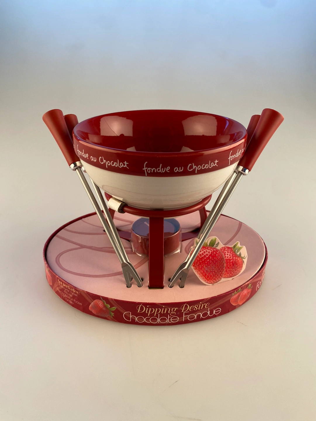 This cute little red & white chocolate fondue set comes with 4 fondue forks and a candle in the base. New in packaging. Made by Jo!e. Makes a sweet holiday hostess gift.