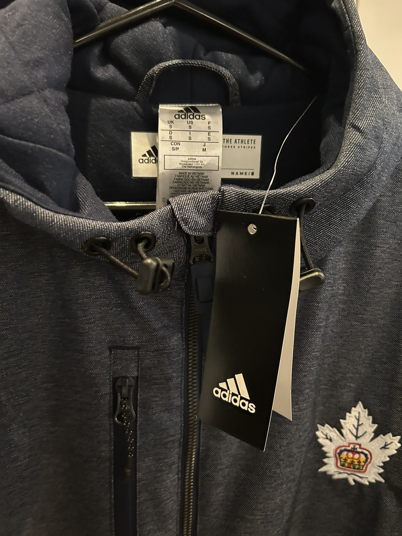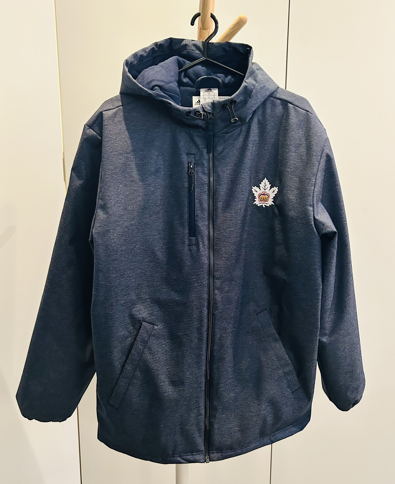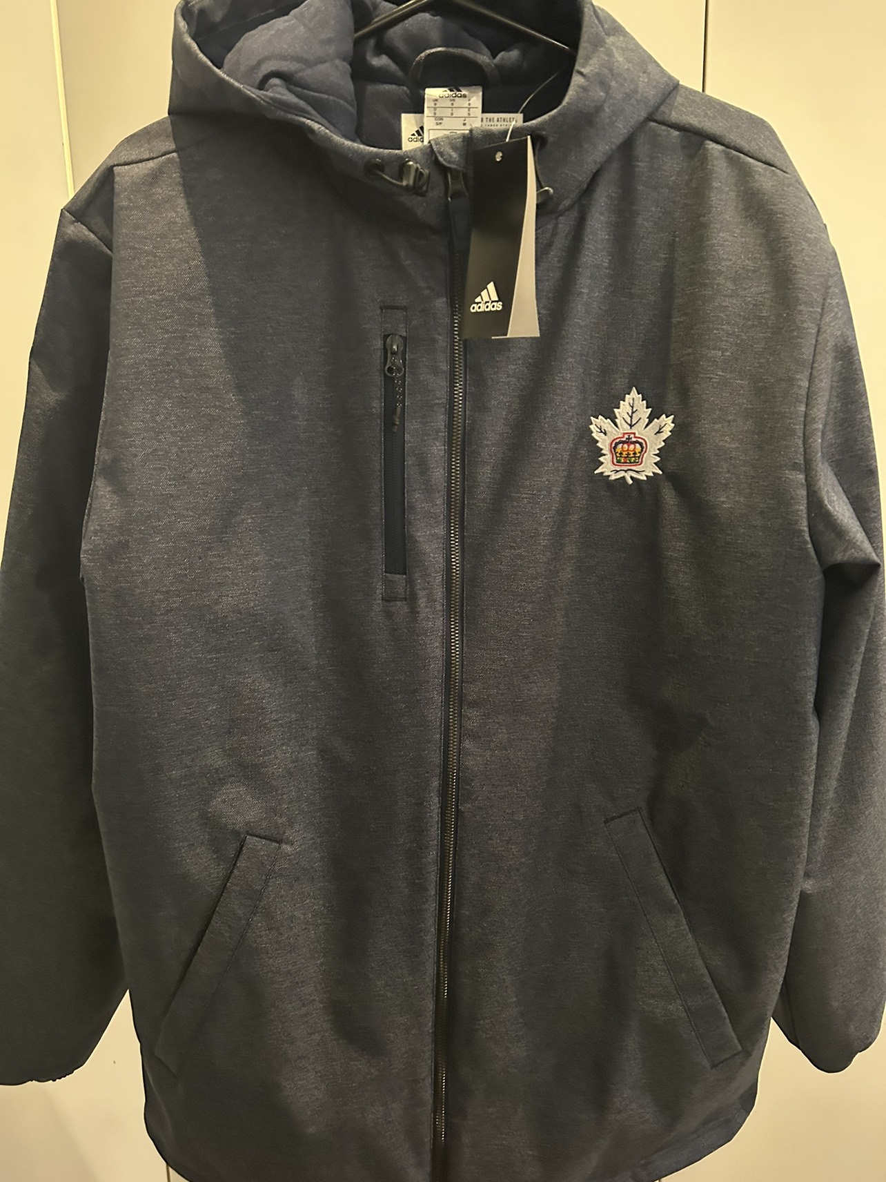 New with tags adidas GB outerwear quilted cozy lined jacket. Brand new. Size small. Several pockets including zip up pockets and interior zip pockets. Hood with drawstrings for warmth. Grey and navy. Very comfy and nice clean look. Never worn. Retails for $179 before tax. Marlee’s logo.