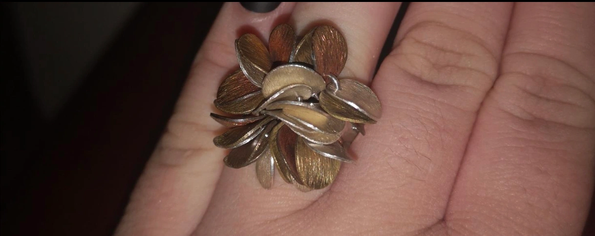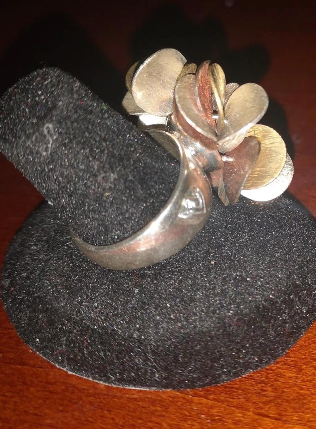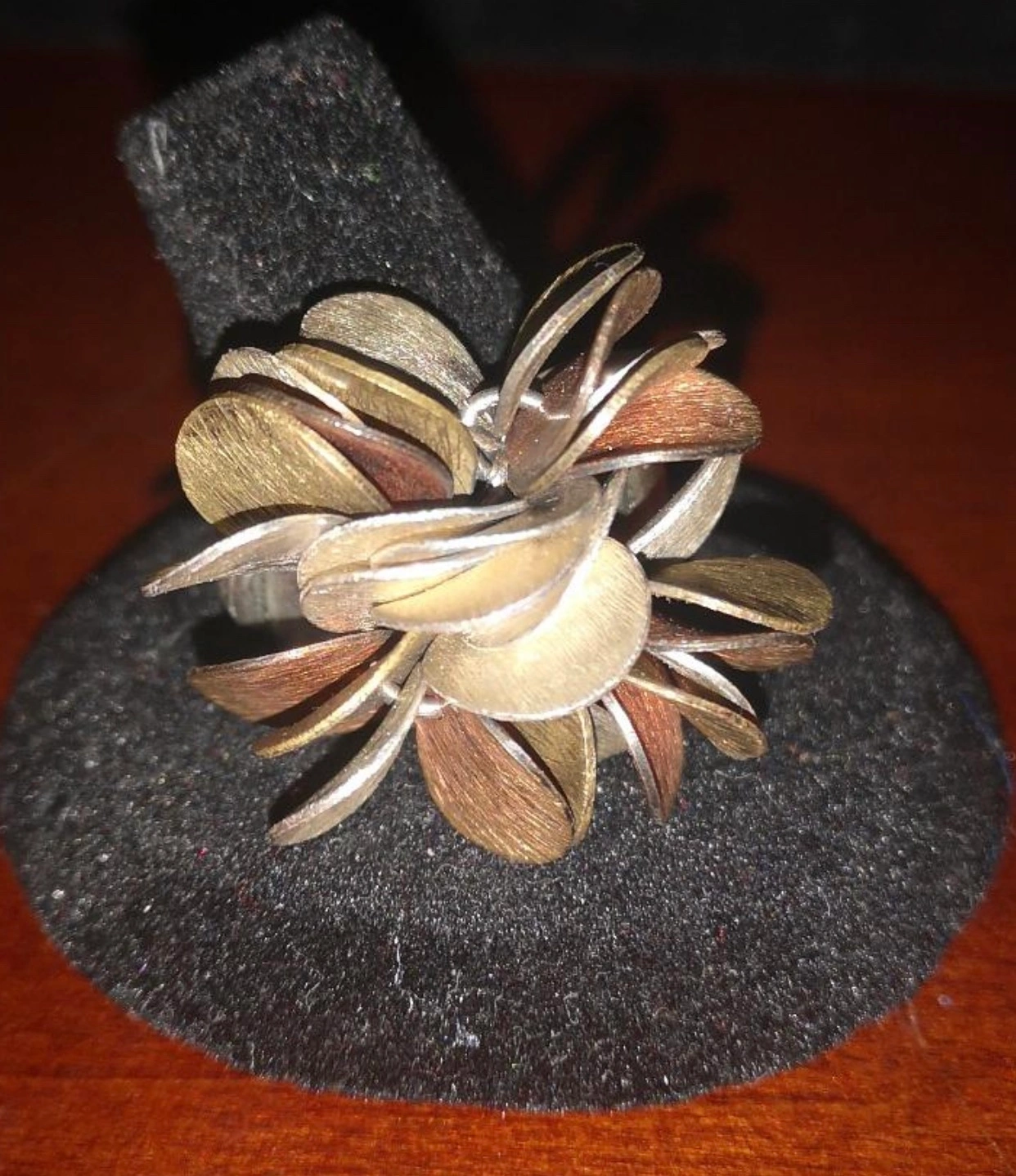 Artisan design features a bold cluster of floral petals of brushed .925 sterling silver, copper, and brass, cha-cha style, atop a bright shiny polished .925 sterling silver ring with a prominently displayed Silpada arrowhead logo on one side. In addition to being absolutely gorgeous this is Retired and no longer available from Silpada since 2011! Very popular! Size is 7/8 Is in Excellent condition was a table Display item. Asking $65 first come basis Pick up Mary & Brock St N Comes from a Smoke & Pet Free home Will delete when sold