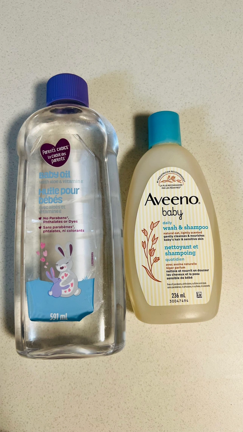 Aveeno Body Wash and Shampoo - 236 ml Parent’s choice Baby Oil - 591 ml From Smoke, Pet and Bug free home Pickup Only