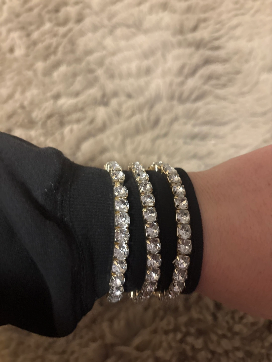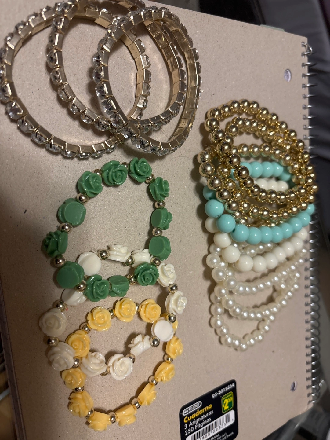 14 bracelets included. Assortment of styles and colours. Perfect for layering or wearing individually. Includes three rhinestone bracelets and 11 beaded bracelets.
