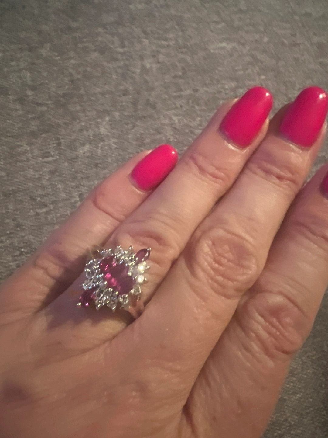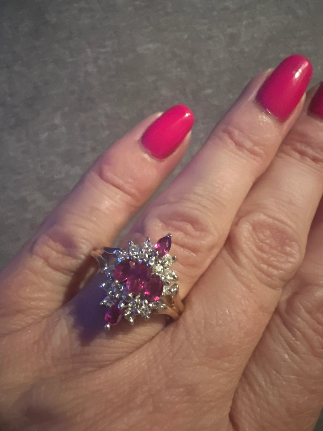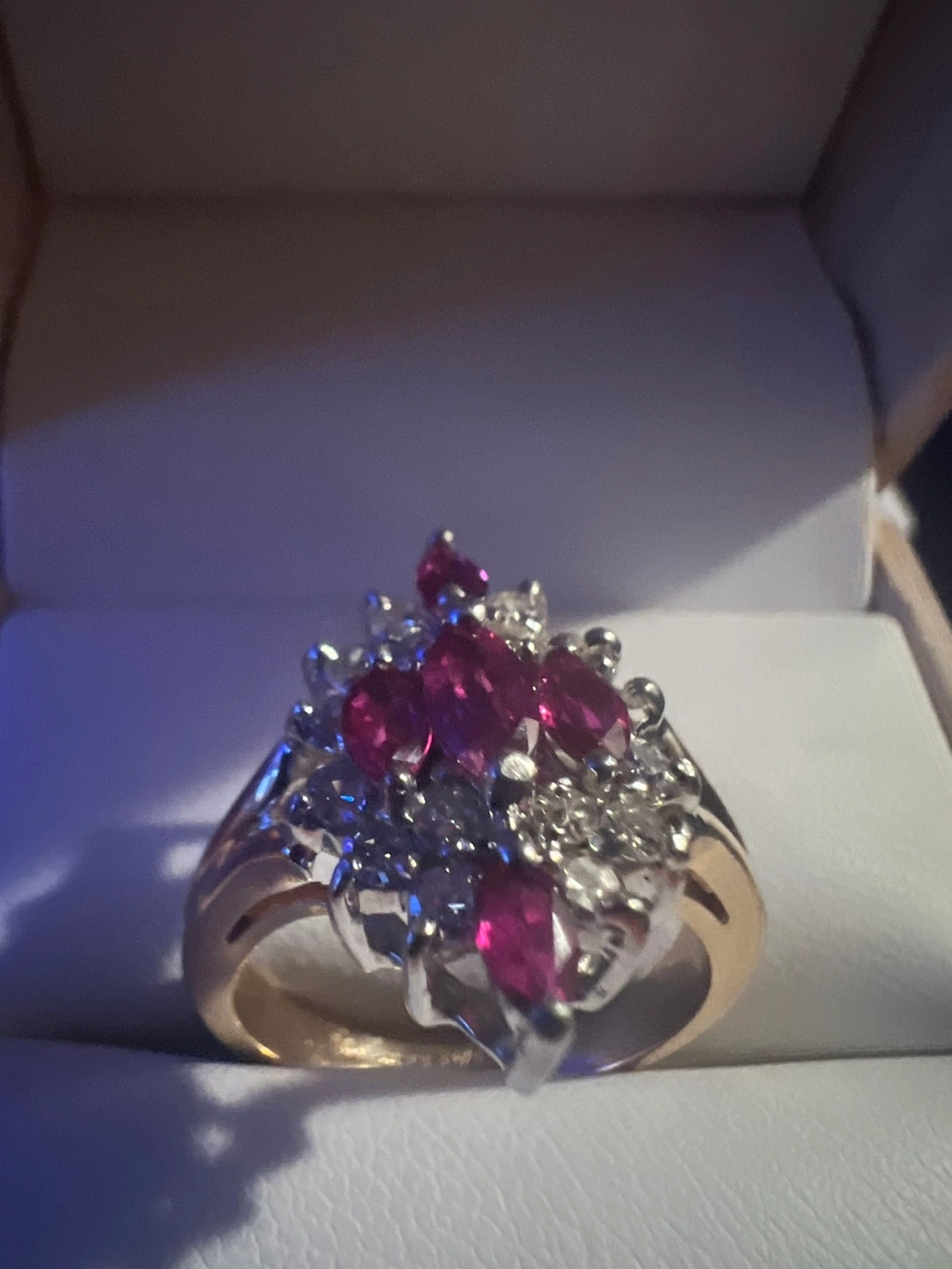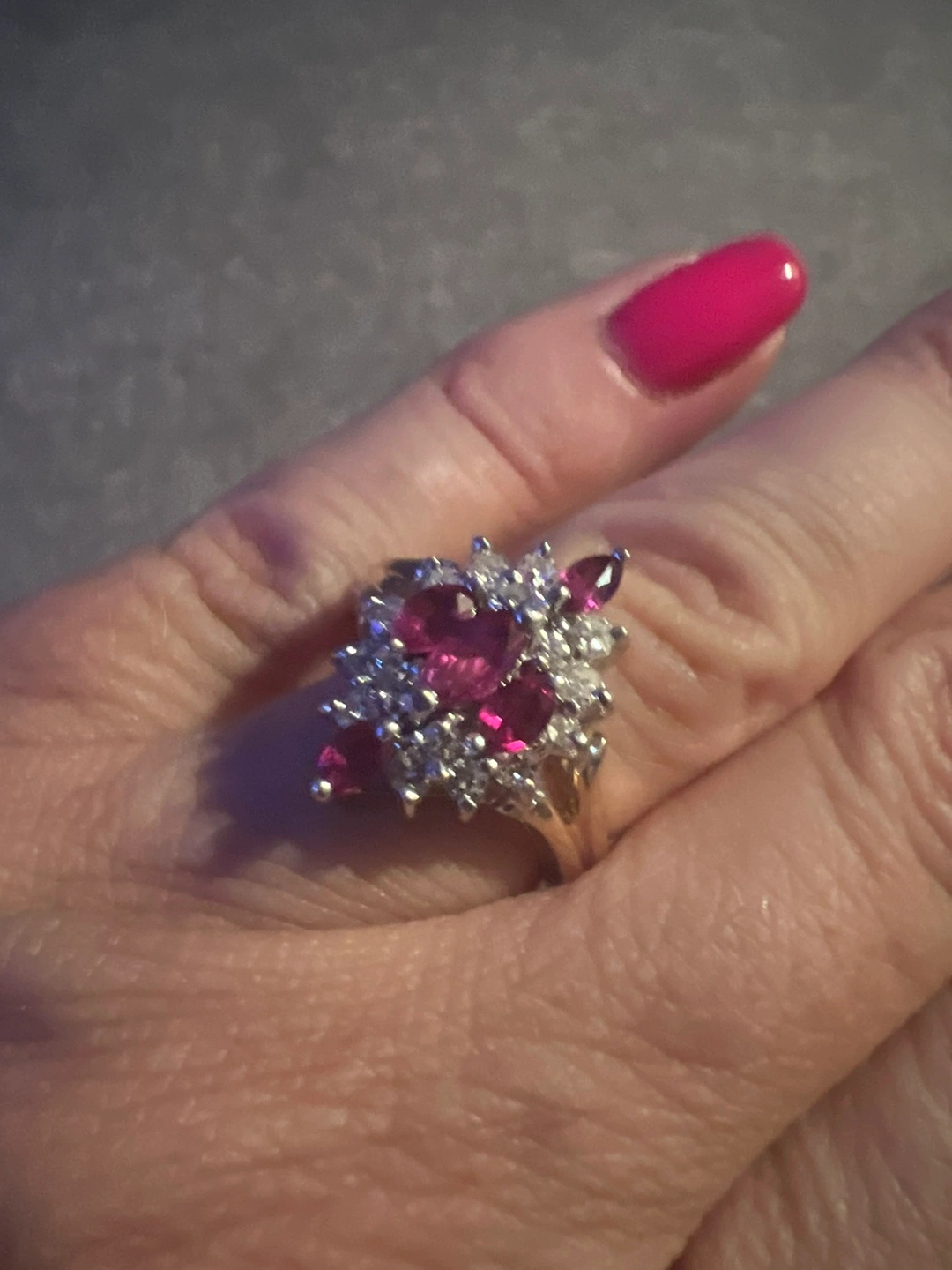 Beautiful 14 k ring featuring a cluster of ruby and diamond stones set in a gold band. It's in excellent condition and comes in a box! A stunning piece to add to your collection