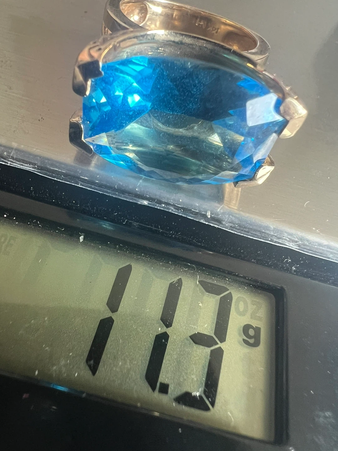 Beautiful Swiss blue topaz ring with a gold band! It's a size 6-6.5 and weighs 11.3 grams. The ring is in great condition and ready for a new home