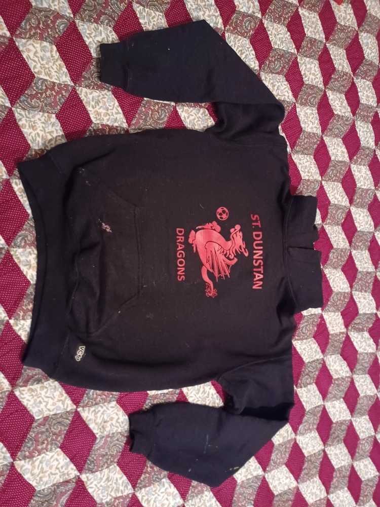 St. Dunstan Dragons elementary catholic school sweat shirt ... with hood... well used some minor stains from painting crafts at school.. otherwise good. size 10-12... youth large ... smoke, pet and pest free home..