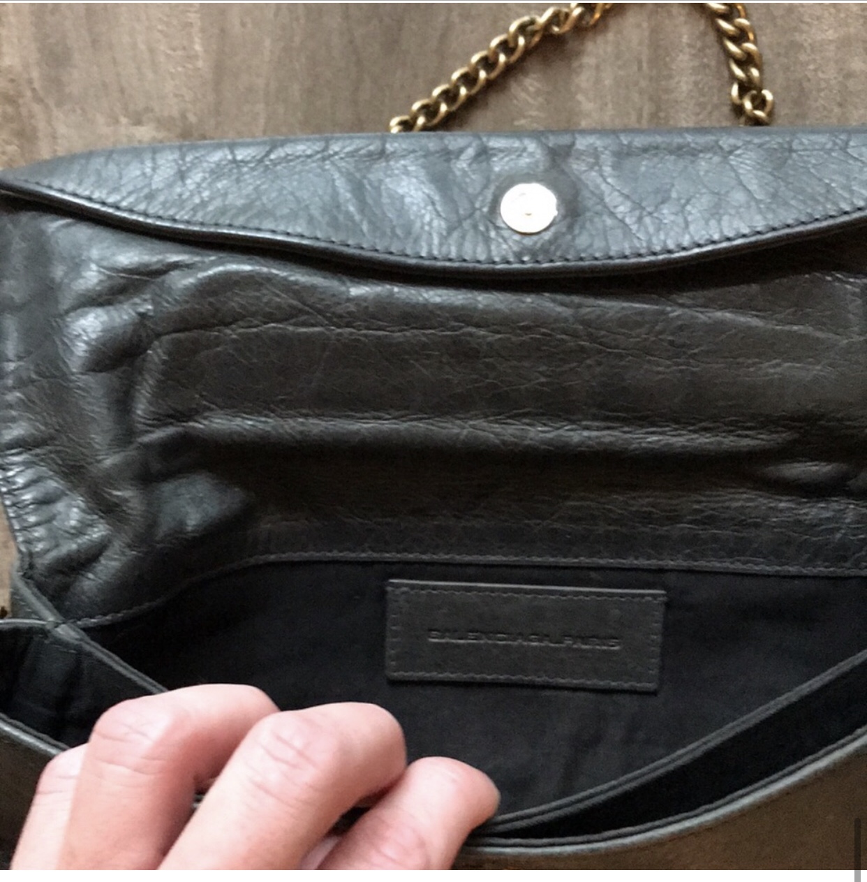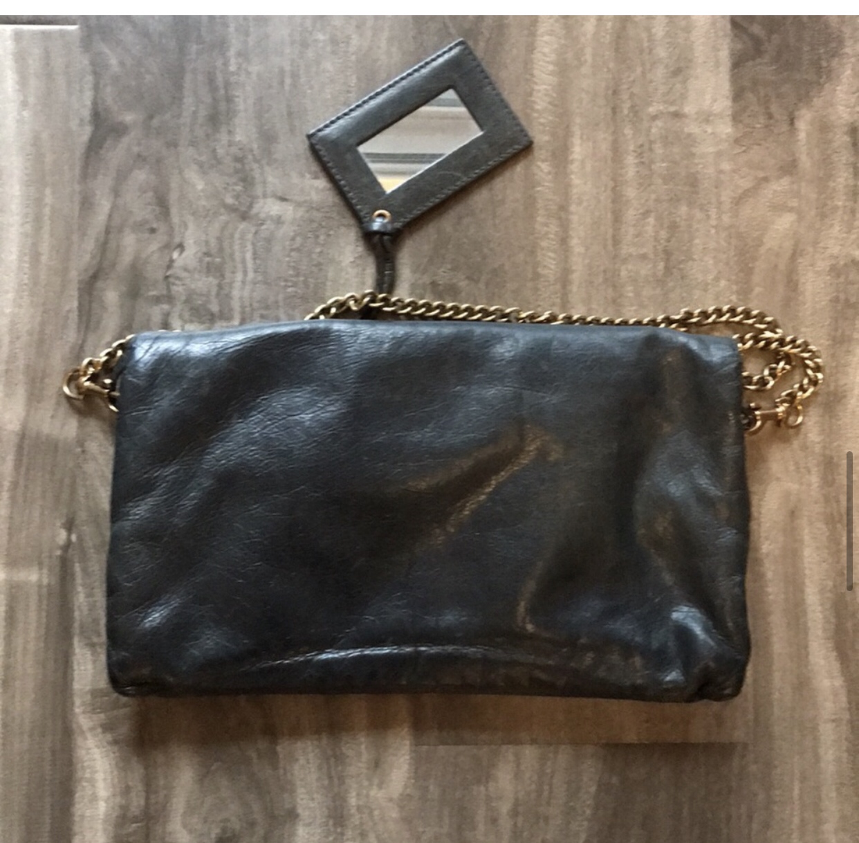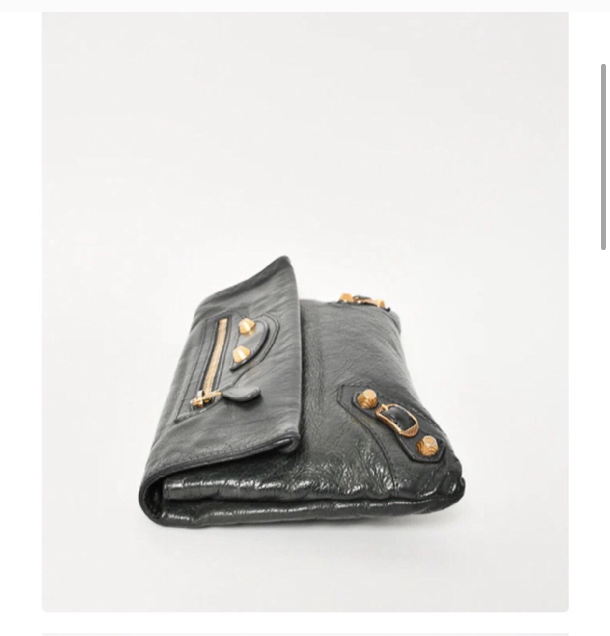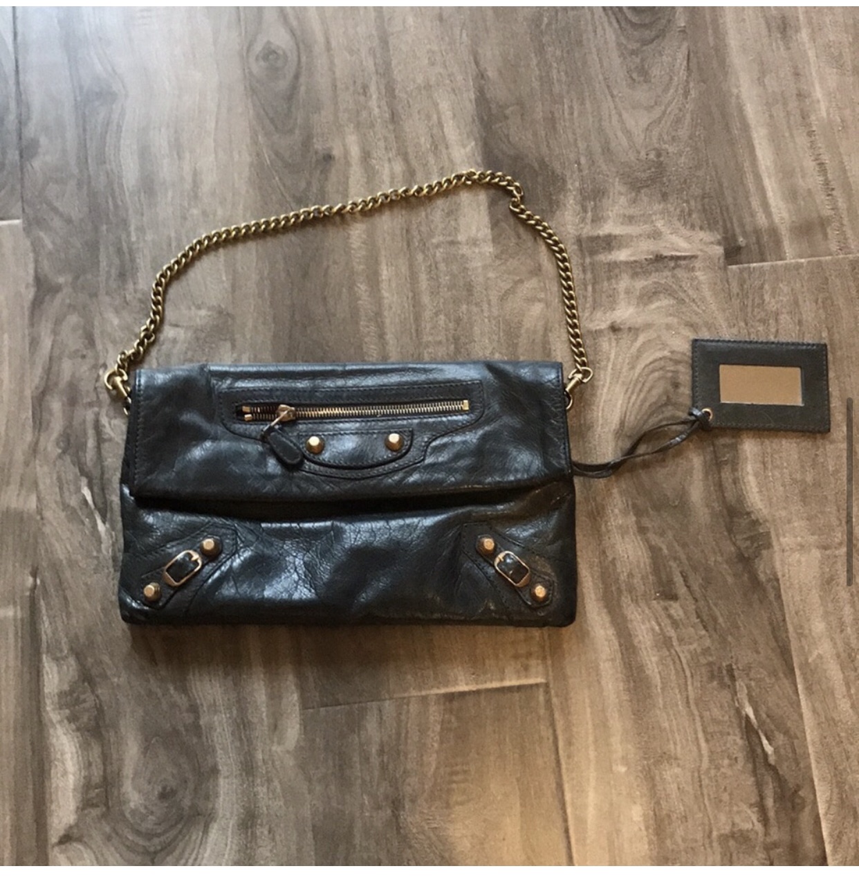 Balenciaga grey - green fold over clutch with giant hardware & added strap Some scuffs, Bronze Color giant hardware. No dustbag. Yes mirror. No cards, have reciept from store I purchased second hand. Has zip pocket and hidden pocket in pouch. Bronze add on strap included Length 11” Height 7” Strap drop 9”