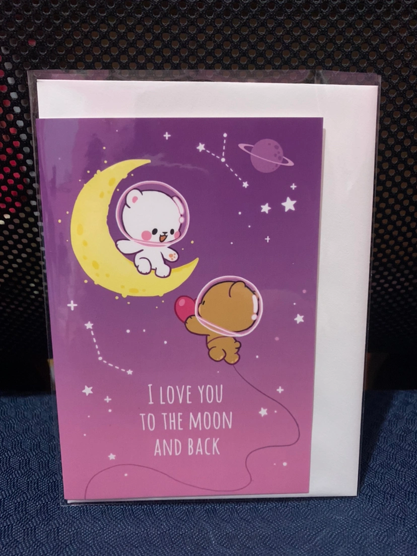 I bought this for seven dollars but I never ended up using it! it’s a super cute and thick Valentine’s Day card. Description below: Let that Valentine know you love them to the moon and back. One 4" x 6" on a hard soft matte card stock with vibrant colors. Includes an elegant white textured envelope with pointed flap Inside is blank and uncoated for that special message Limited Time only