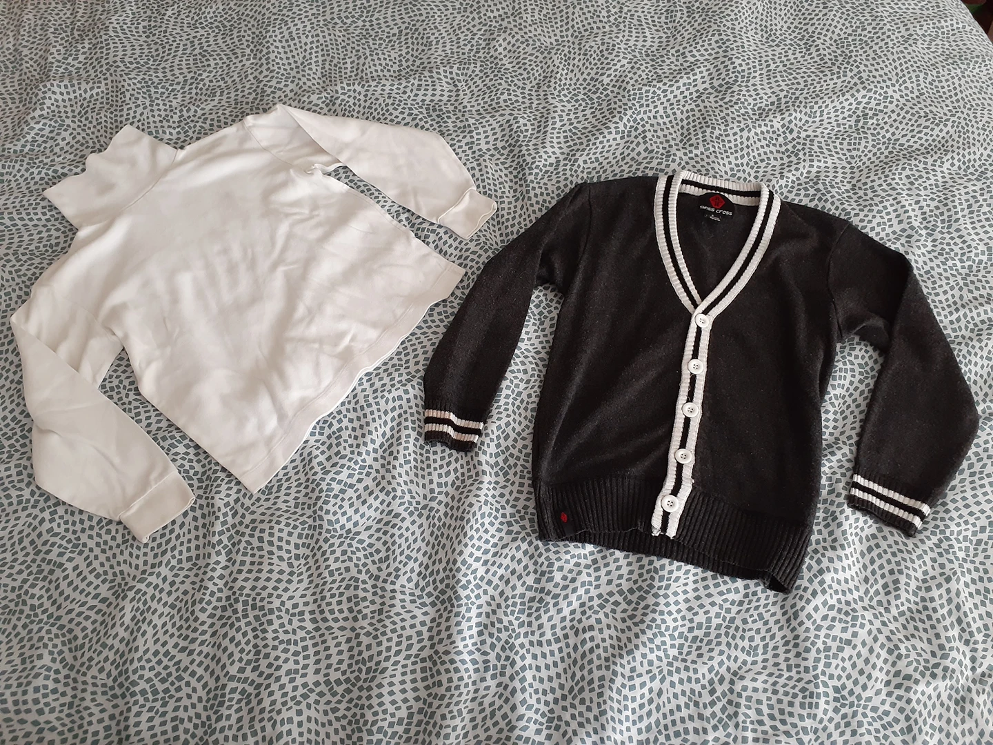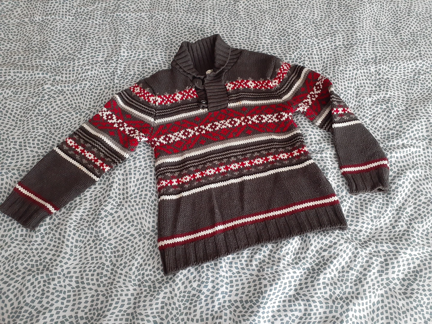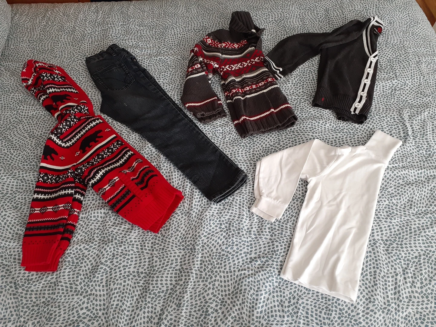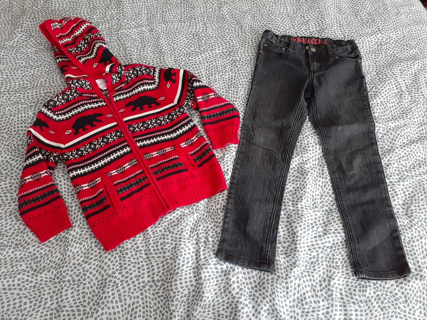 Boys size 5/6 lot -5 items ... red zip up hooded sweater, charcoal grey jeans, sweater with button collar, white turtle neck, button up sweater ... smoke free/ pet free home