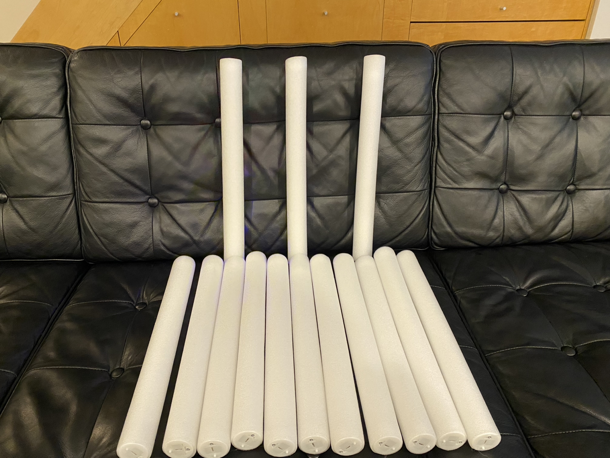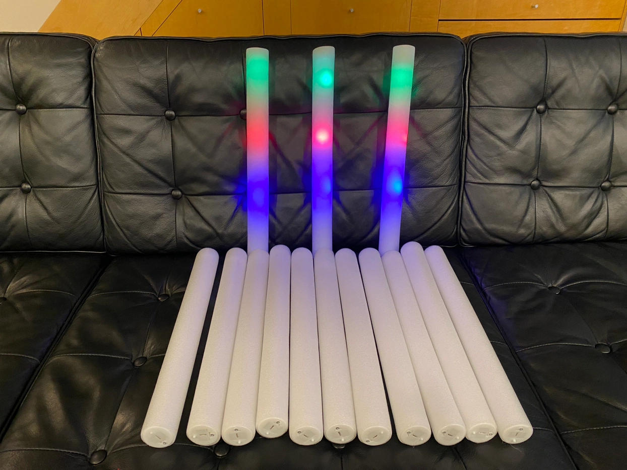 Foam Glow Sticks with three distinct settings. We used these to get the party started at our reception and they were a HUGE hit for all ages. We only have 14 left out of 50 as people loved them so much, they took them home LOL. All 14 have batteries included and enough life left for another party.