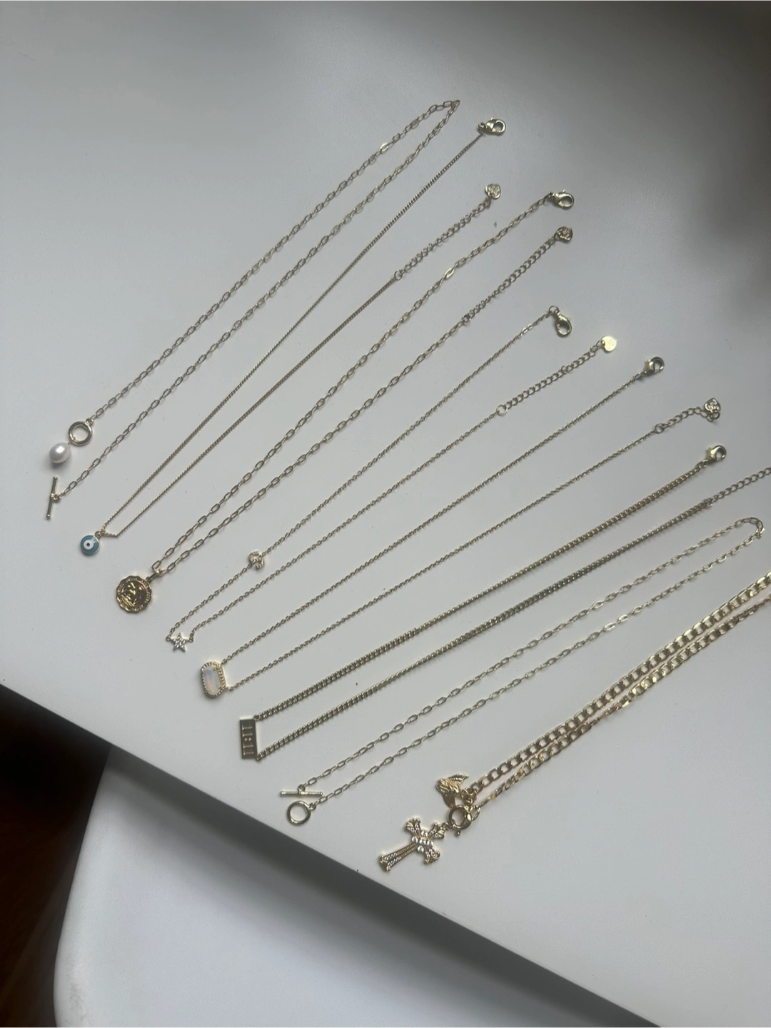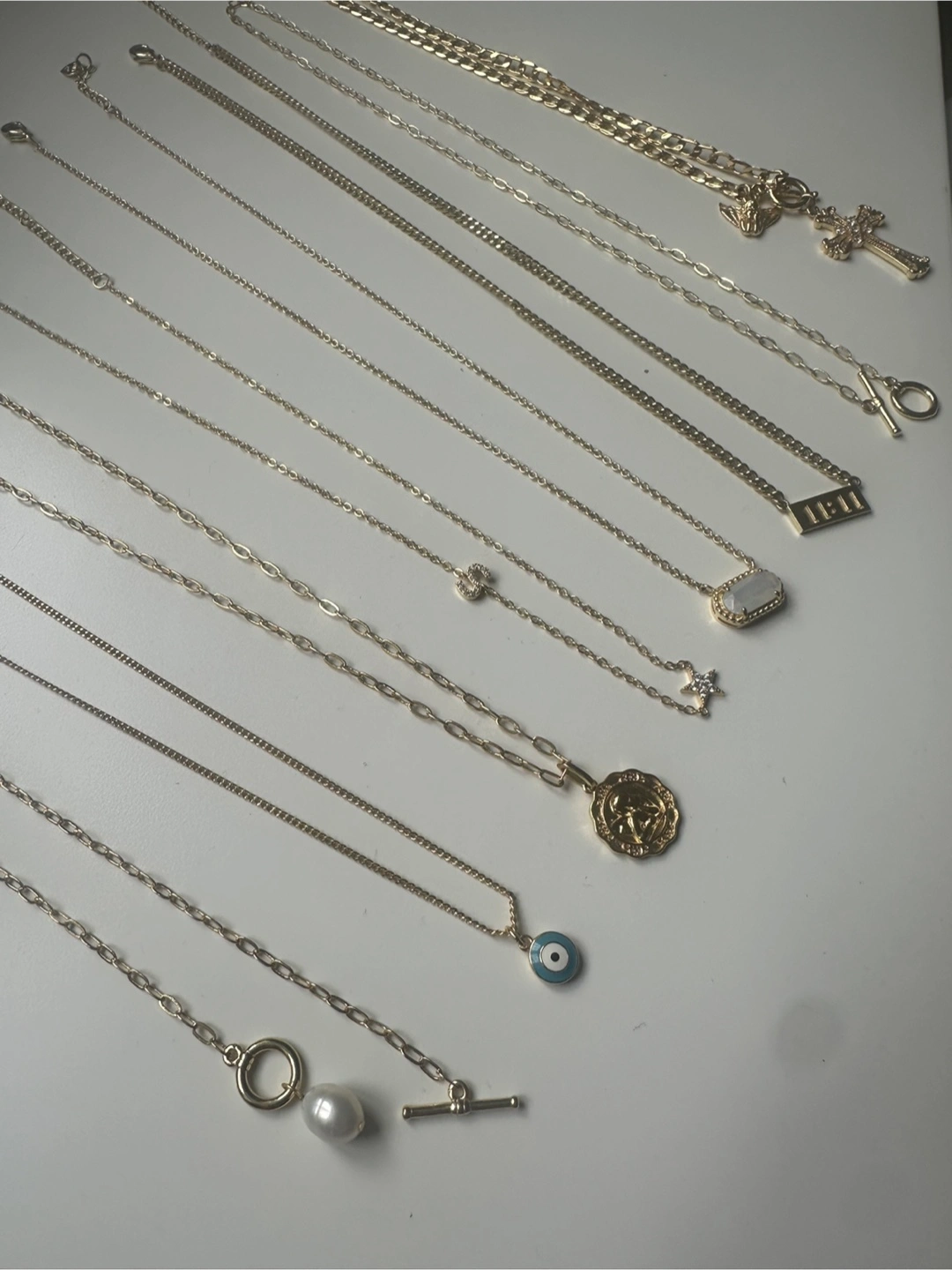 ‼️15$ EACH‼️ selling a bunch of my gold plated necklaces i got for my birthday! they’re long lasting and water resistant. i’m selling them because i have way too many and need to declutter. message me if you’re interested in specific ones i have plenty! (you can also suggest different designs, i may have something similar as i have a ton and they’re not all in the photo above) (scratched off necklaces in the pink in the last photo are on hold) cash only please! ☺️