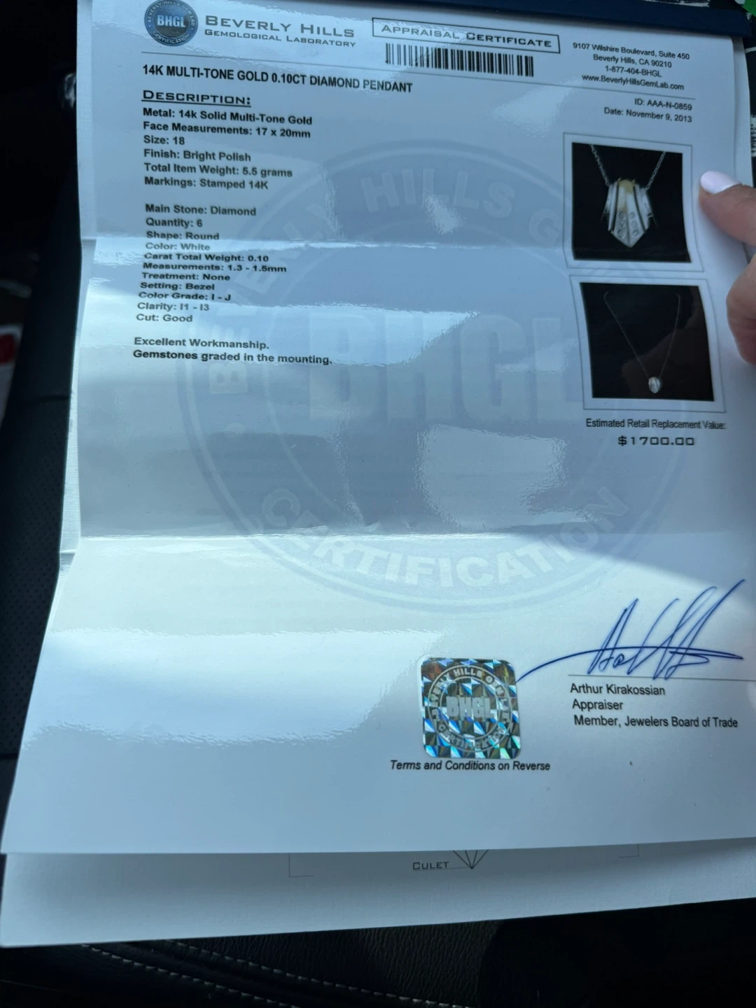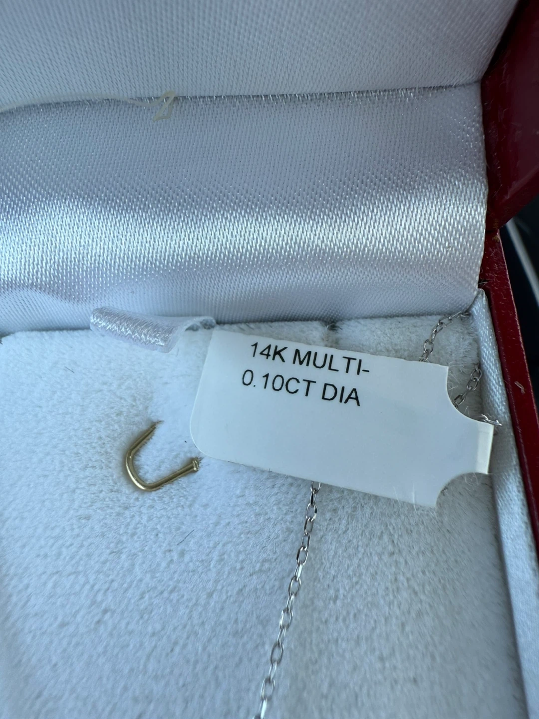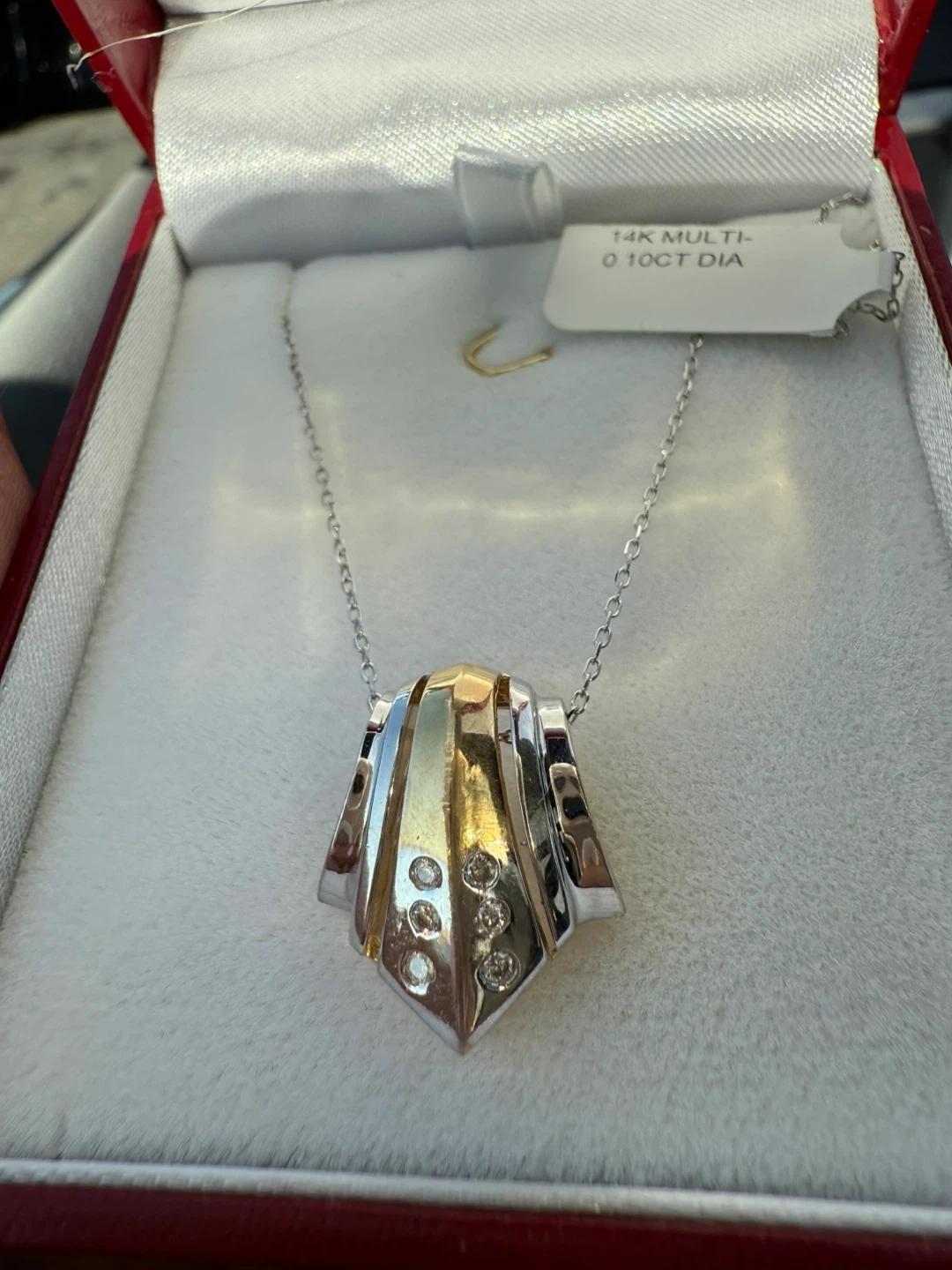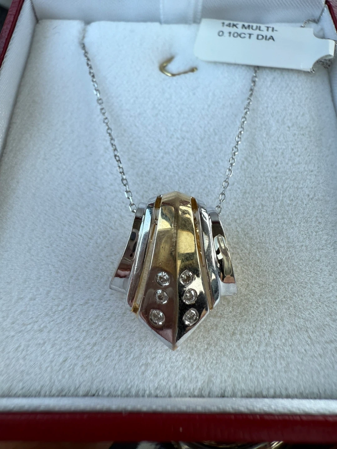 Selling a beautiful 14K multi-tone gold pendant with 0.10ct diamonds. The face measurements are 17 x 20mm, and the chain is 18 inches long. It features bright polish and has a total item weight of 5.5 grams. The main stone is a round-shaped diamond with good cut and clarity of I1-I2. Gemstones are graded in the mounting and the pendant is stamped 14k.