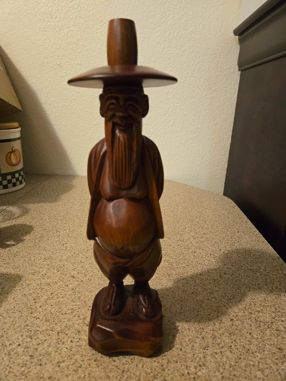 Here's a charming wooden carved figurine, perfect for adding a touch of character to your home! It features a man with a long beard and a wide-brimmed hat, all carved from a lovely brown wood