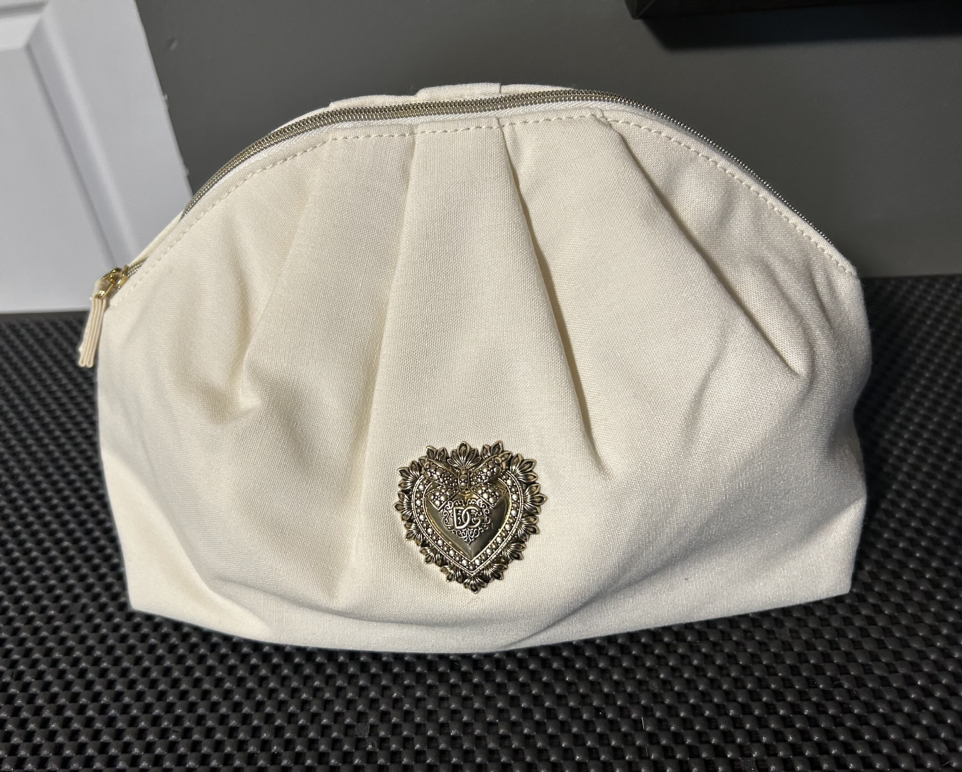 Dolce&Gabbana Compact Makeup Pouch $25 New/Unused Please refer to pics for measurement Colour White Gorgeous fancy makeup bag Has antique gold tagged logo on the front and tag on the interior Made with soft pu leather material Has filler so it’s spongy Zipper enclosure More wide on the bottom Will fit a lot of items Perfect for travel Pick up near wonderland