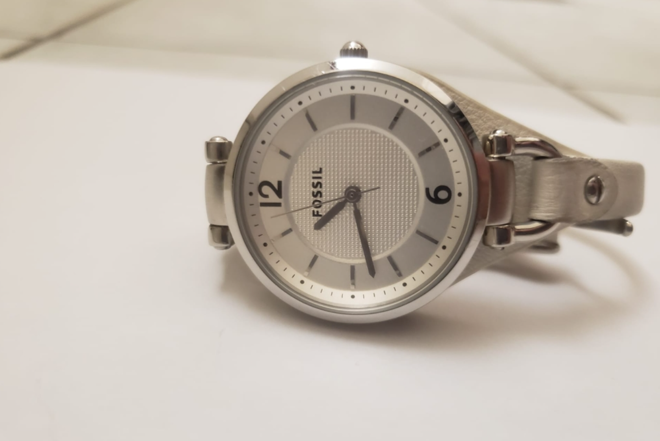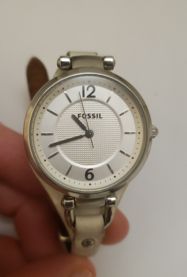 Very beautiful and super light weight watch from Fossil. The white band is real leather, but has discolored overtime. It is super easy to replace though and was purchased for $120! **Please note that price is negotiable provided you can pick up in the Woodbridge/Vaughan area. Check out my other listings to get an additional discount!