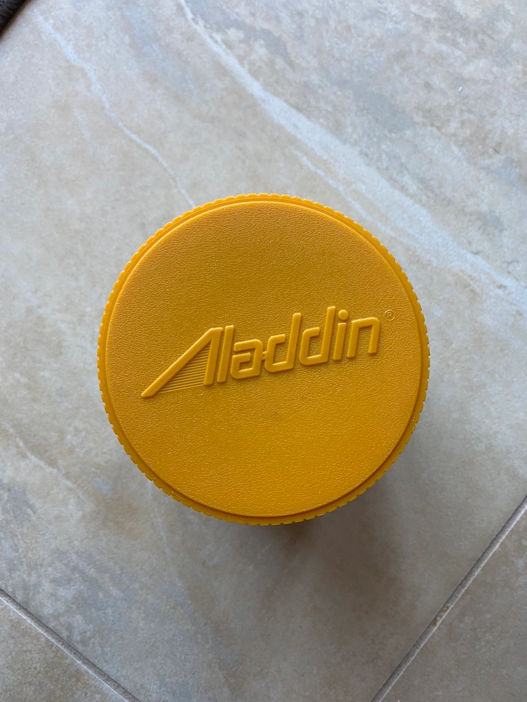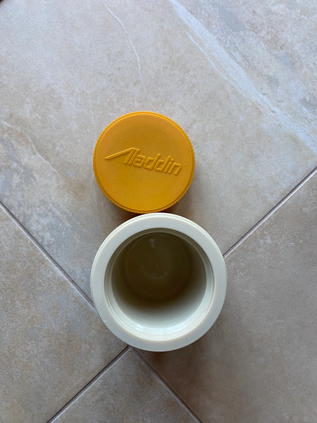 This is an Aladdin brand 10oz wide mouth Thermos. Kept in excellent condition. Great for hot soups or cold beverages.