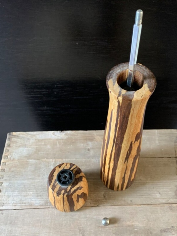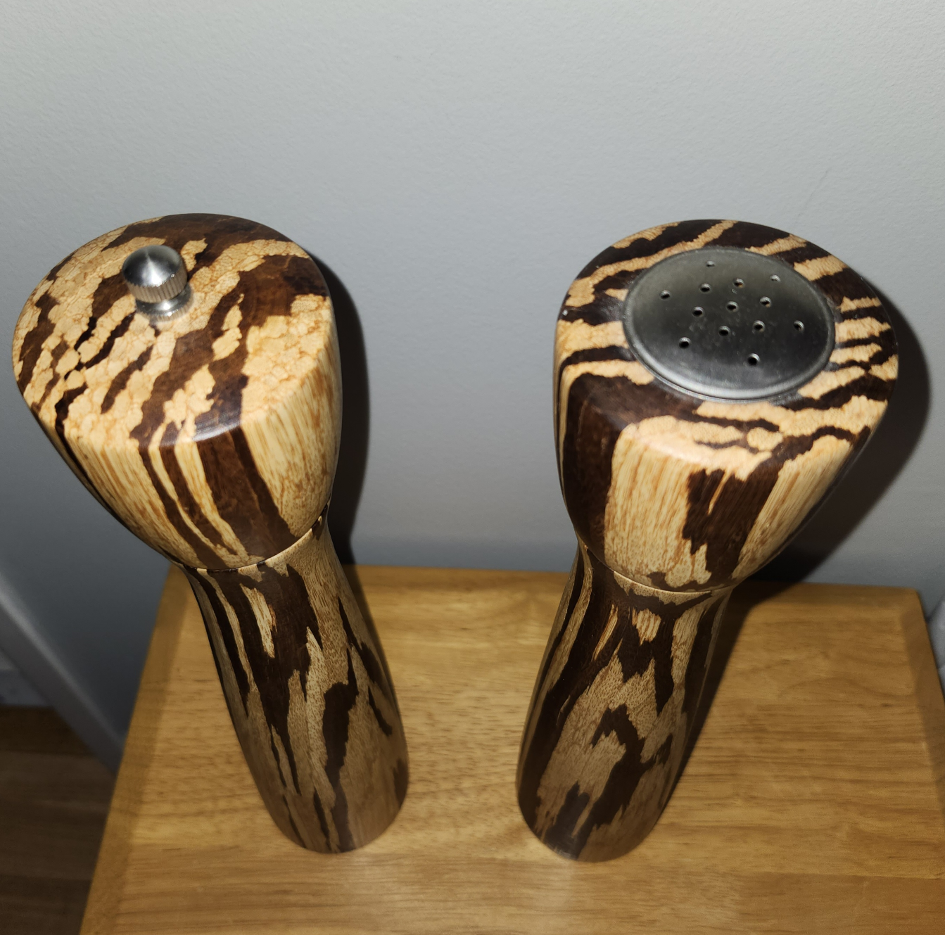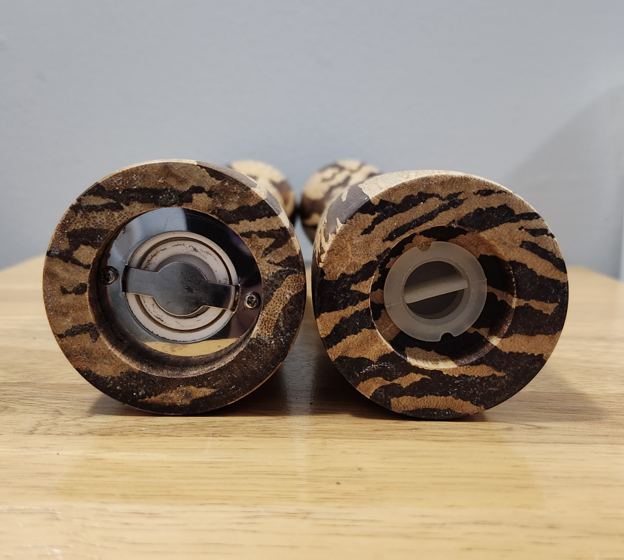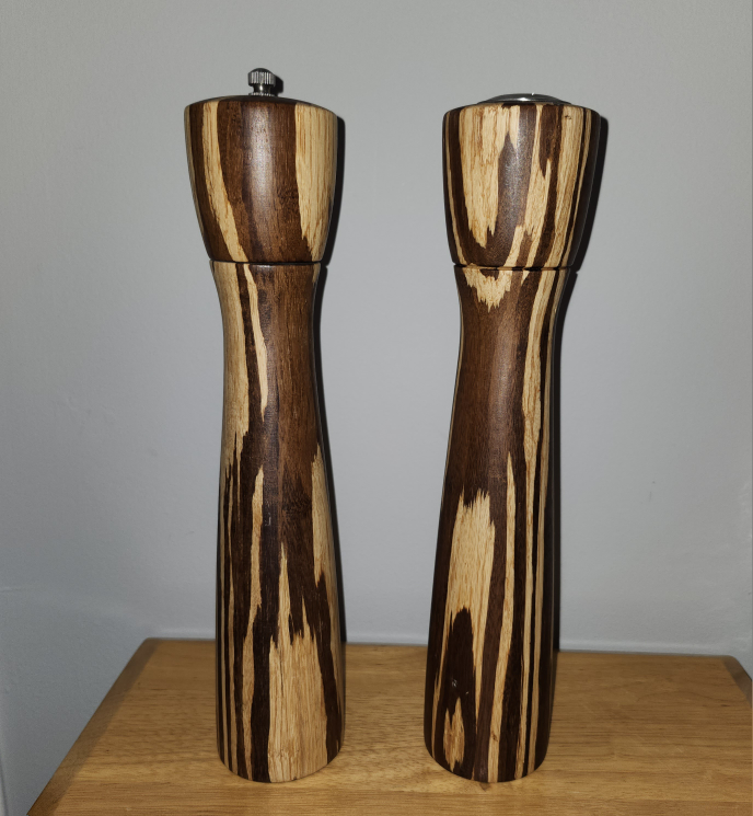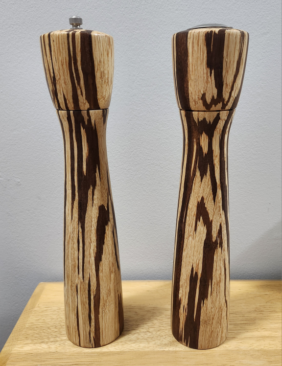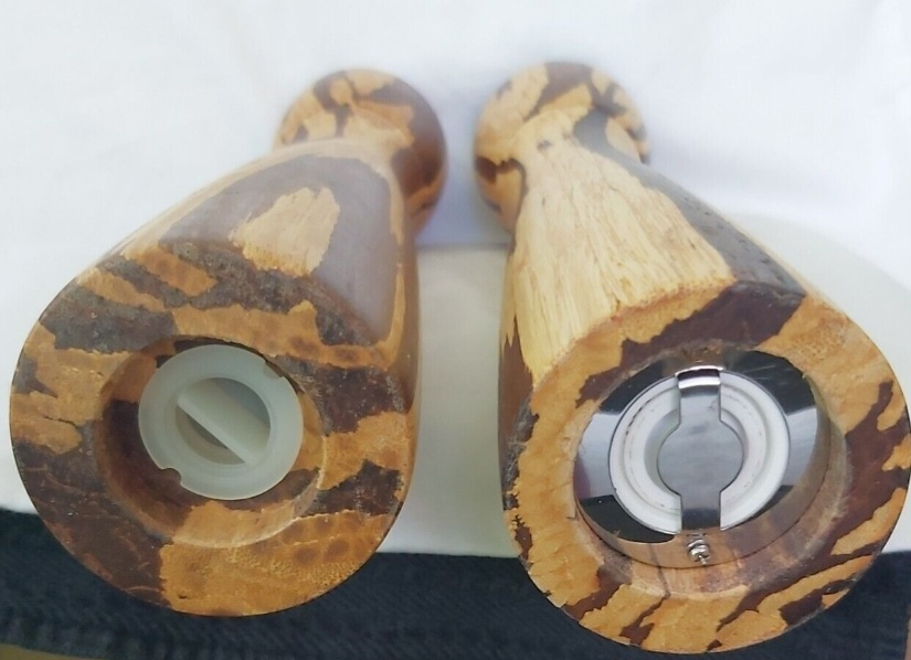 VINTAGE SOLID WOOD SALT SHAKER & PEPPER MILL SET 🤎💛 RARE FIND❗️MCM - Mid Century Modern Eye-Catching Tiger Wood Appearance ✔️Excellent Condition. NOW $15 🔥 (Was $20). (Etsy & Ebay prices are $37 - $115 + shipping) 12"H × 2.25" Diameter Smoke & Pet Free Home. Danforth & Victoria Park Ave. 🌞 Please check my other posts.
