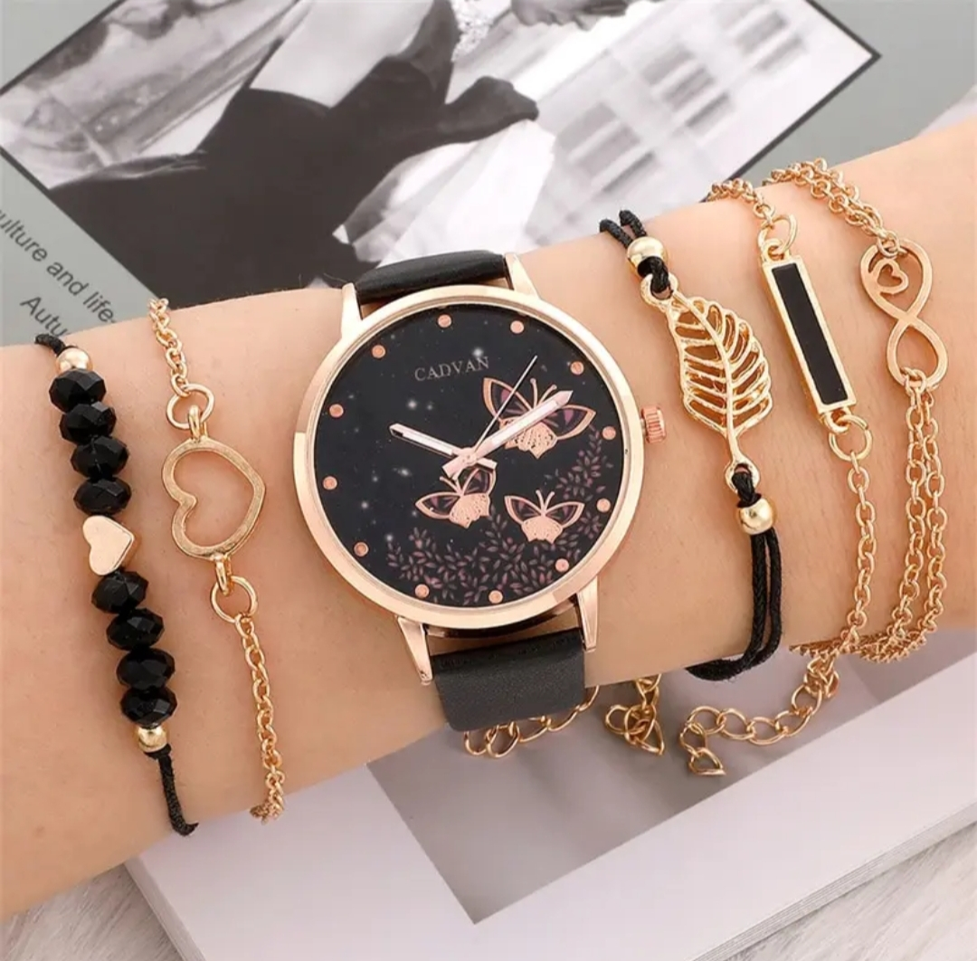 6 PC's Women's Watch and Bracelet Set Simple Casual Butterfly Analog Wrist Watch with 5 Bracelets It's brand new in an intact packet (No Box) Pick up Preferable but delivery can be done with an upfront delivery charge of $5.00