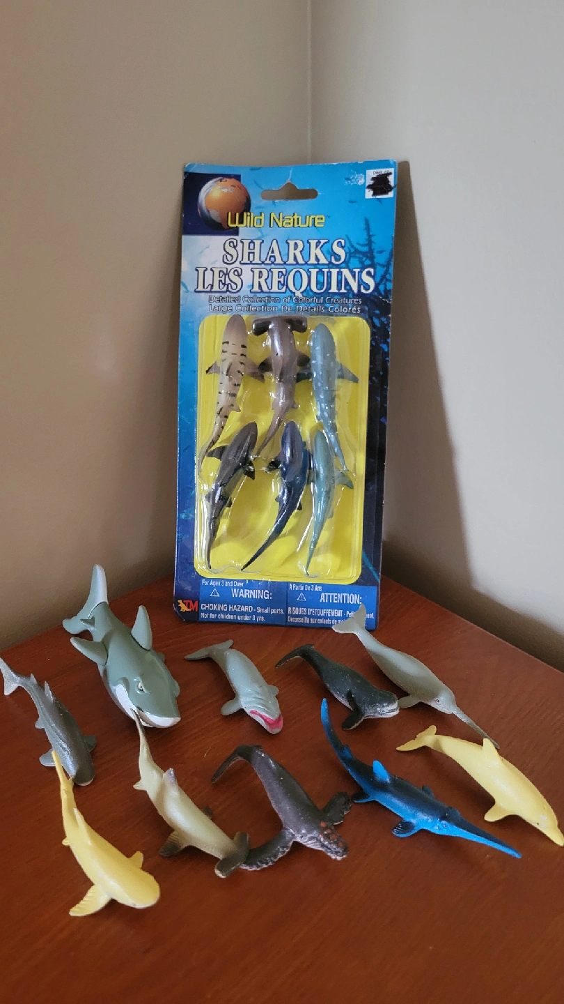 Selling a Wild Nature Sharks Les Requins toy set total 16 pieces. It's a detailed collection of colorful creatures, perfect for ages 3 and over. The set includes a variety of shark figures in different colours and designs. Great for imaginative play! from a pet and smoke free home
