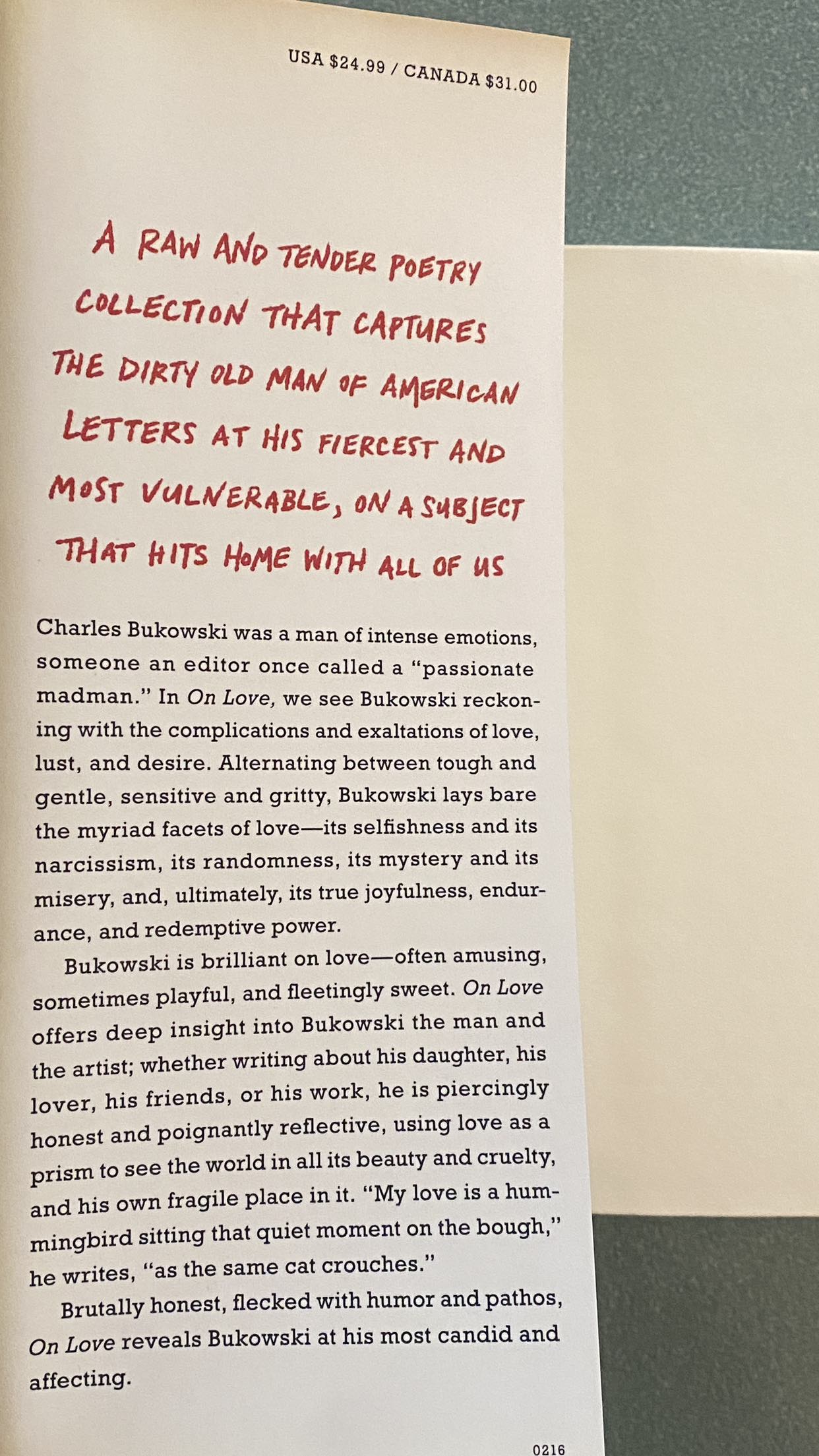A companion to On Writing and On Cats: A raw and tender poetry collection that captures the Dirty Old Man of American letters at his fiercest and most vulnerable, on a subject that hits home with all of us. Charles Bukowski was a man of intense emotions, someone an editor once called a “passionate madman.” In On Love, we see Bukowski reckoning with the complications and exaltations of love, lust, and desire. Alternating between tough and gentle, sensitive and gritty, Bukowski lays bare the myriad facets of love—its selfishness and its narcissism, its randomness, its mystery and its misery, and, ultimately, its true joyfulness, endurance, and redemptive power. Bukowski is brilliant on love—often amusing, sometimes playful, and fleetingly sweet. On Love offers deep insight into Bukowski the man and the artist; whether writing about his daughter, his lover, his friends, or his work, he is piercingly honest and poignantly reflective, using love as a prism to see the world in all its beauty and cruelty, and his own fragile place in it. “My love is a hummingbird sitting that quiet moment on the bough,” he writes, “as the same cat crouches.” Brutally honest, flecked with humor and pathos, On Love reveals Bukowski at his most candid and affecting. Charles Bukowski is one of America's best-known contemporary writers of poetry and prose, and, many would claim, its most influential and imitated poet. He was born in Andernach, Germany, and raised in Los Angeles, where he lived for fifty years. He published his first story in 1944, when he was twenty-four, and began writing poetry at the age of thirty-five. He died in San Pedro, California, on March 9, 1994, at the age of seventy-three, shortly after completing his last novel, Pulp (1994). Excellent condition. Like new, except some pages have yellowed with age, which is very hard to see. Hardcover.
