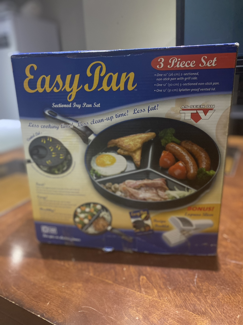 Do you love to cook but have little time and hate doing the dishes? This sectioned frying pan with lid is perfect for you! Cooking is a breeze and only 1 pan to clean. The three-sectioned design allows for separate cooking of different ingredients, making it great for making stir-fry dishes or cooking multiple items at once. The brand new set includes: ✅the splatter-proof vented lid ✅12” 3 sectioned non stick pan ✅10” 2 sectioned non stick pan with GRILL side ✅Bonus! Recipe booklet and Express slicer!!