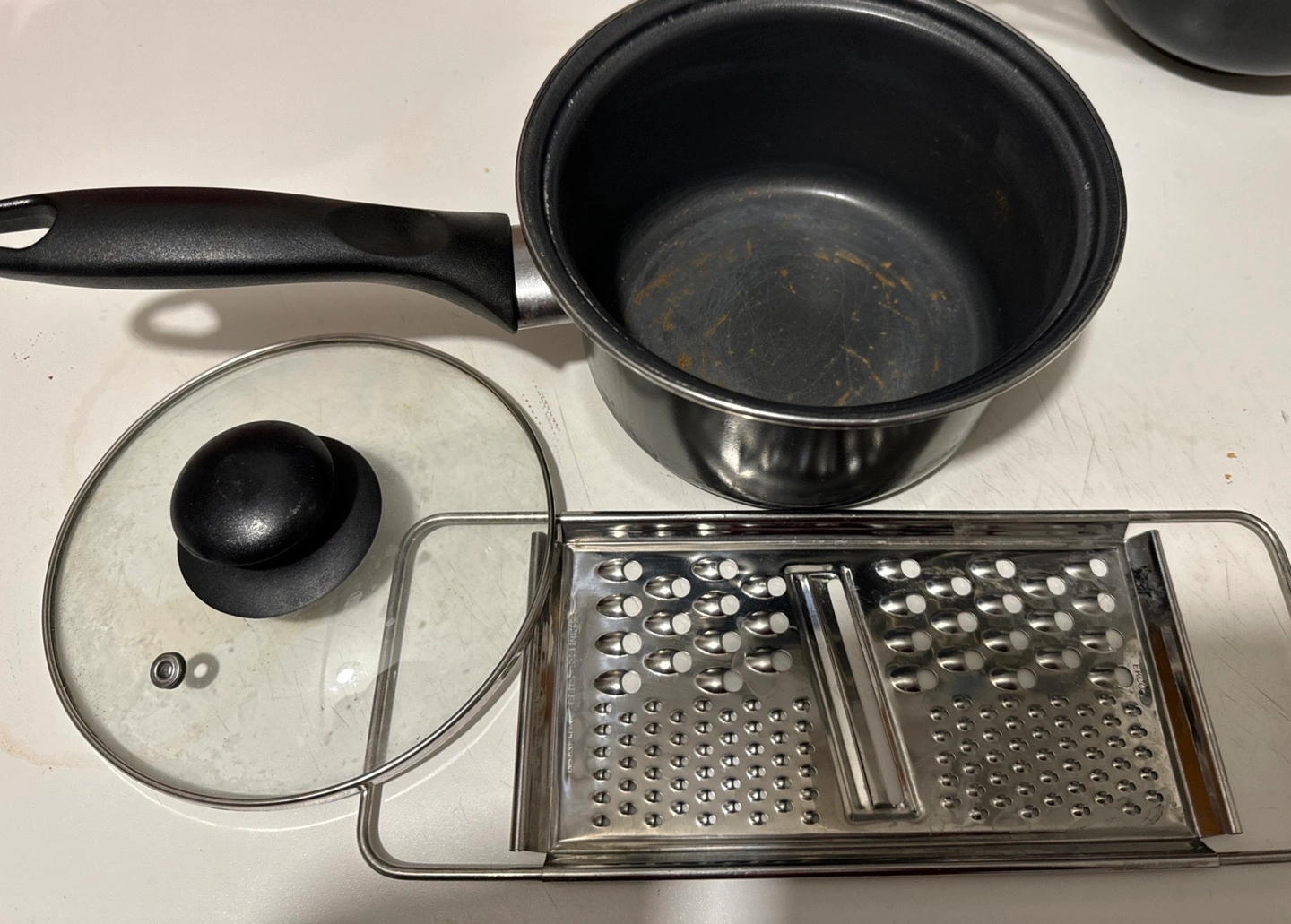 The grater is in good condition as it has been lightly used once or twice. The saucepan has scratches on the inside, every thing else is okay.