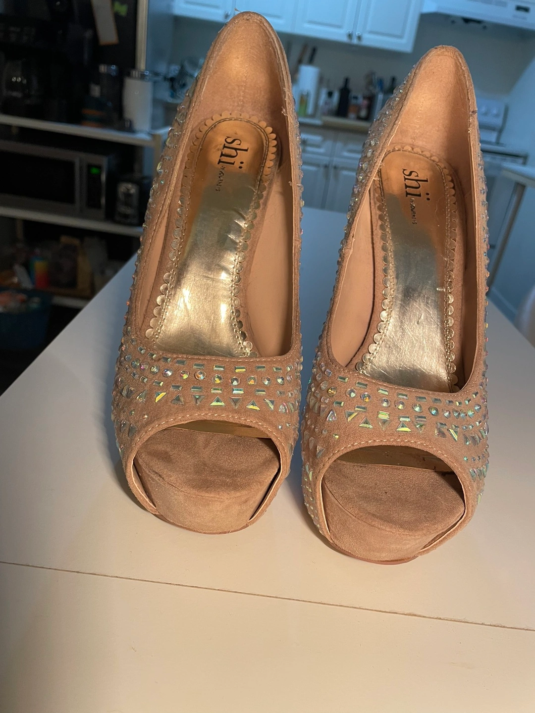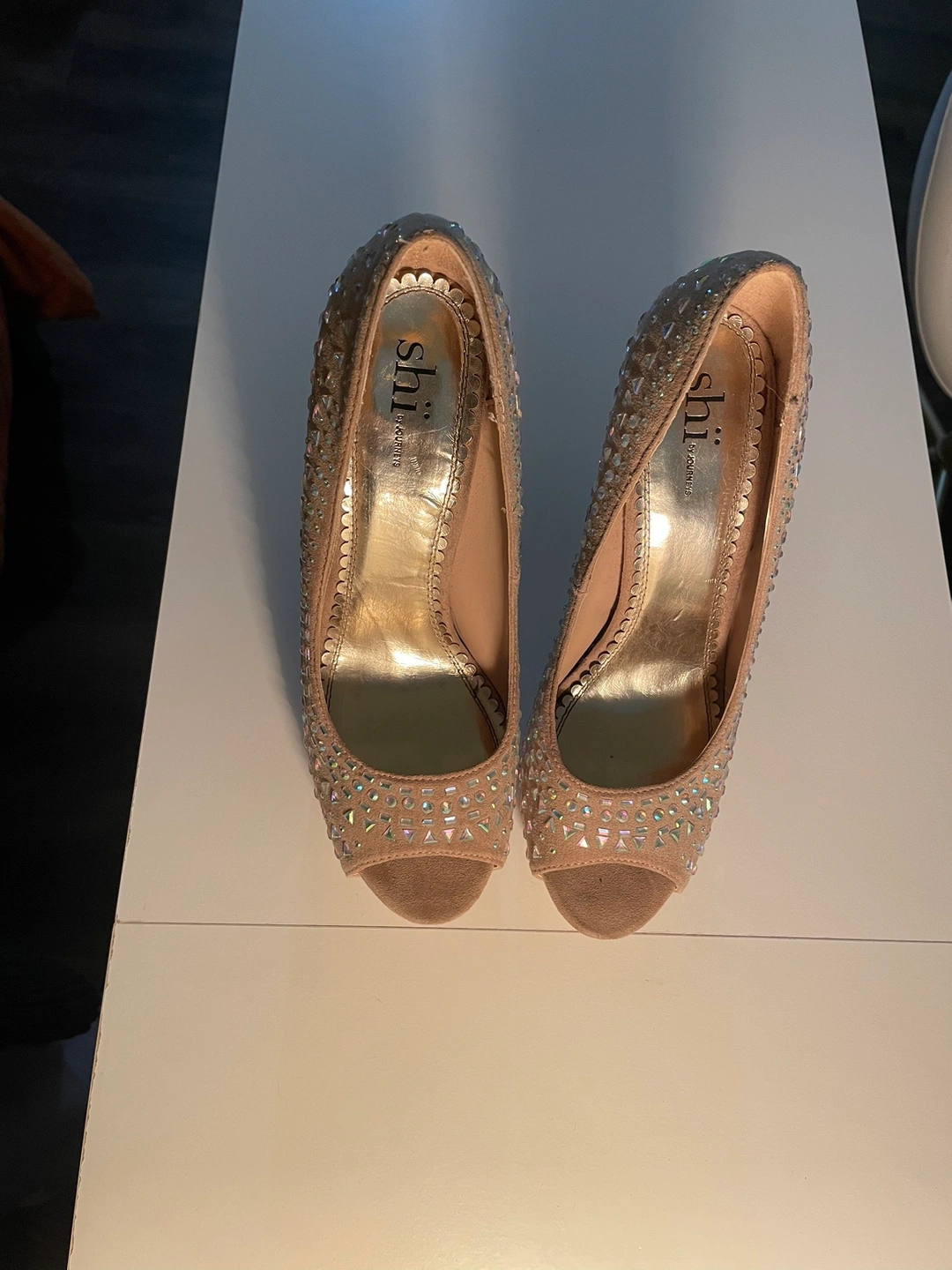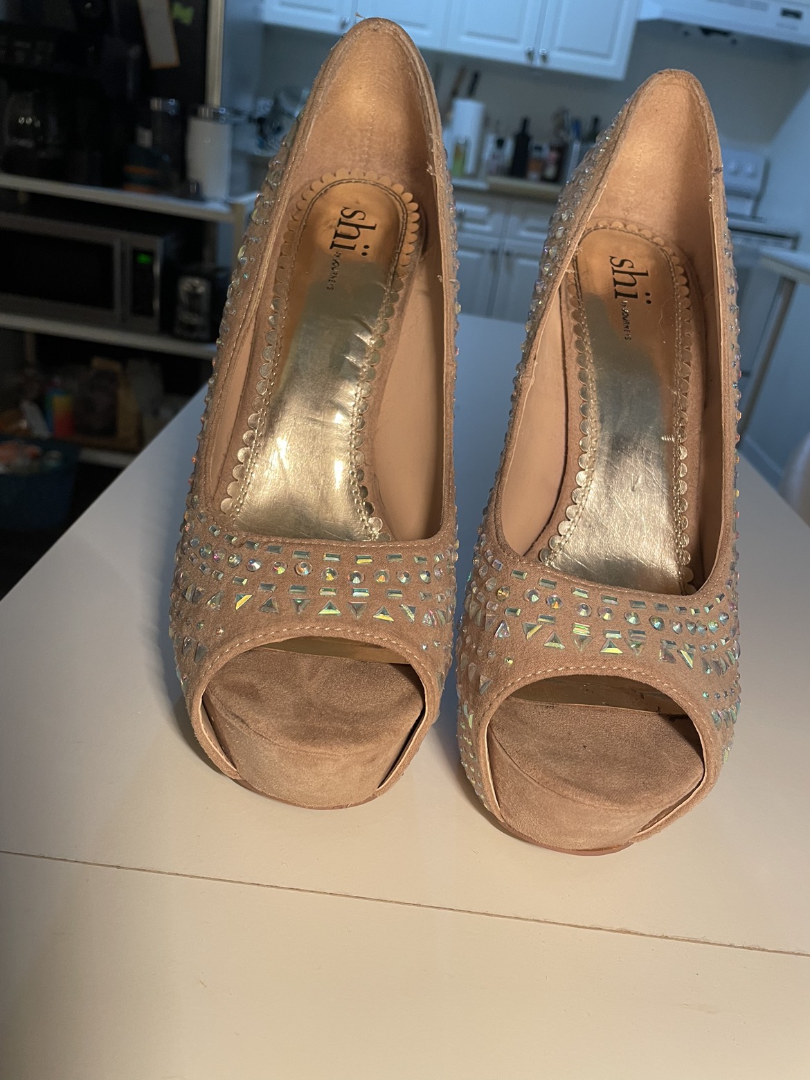 Shï by journeys, not made anymore. Worn once for prom. Would be great for prom, wedding, night out or just everyday wear. No rhinestones missing just small amount of wear on sole. Originally $160