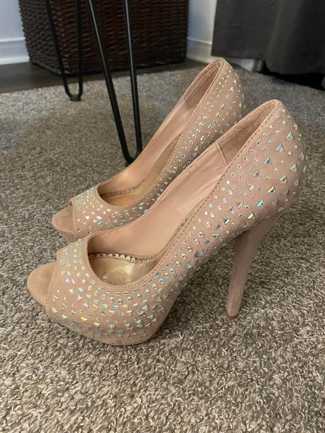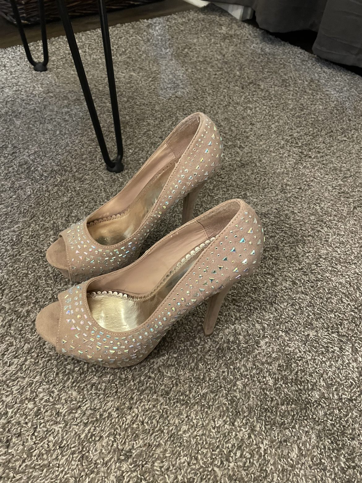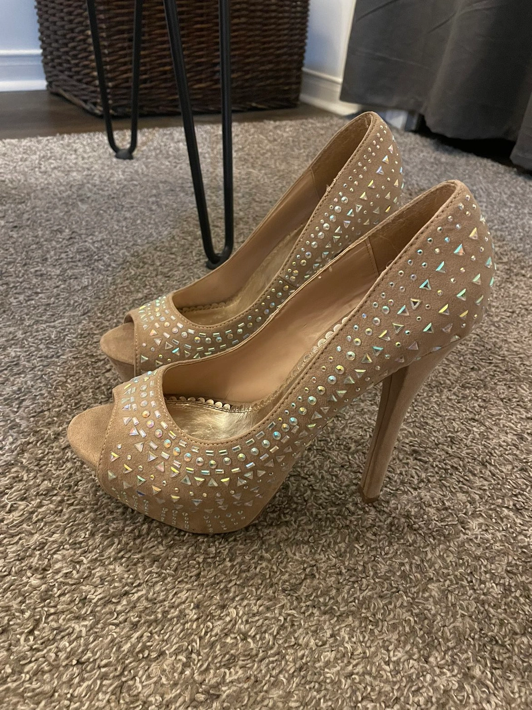Shï by journeys, not made anymore. Worn once for prom. Would be great for prom, wedding, night out or just everyday wear. No rhinestones missing just small amount of wear on sole. Originally $160