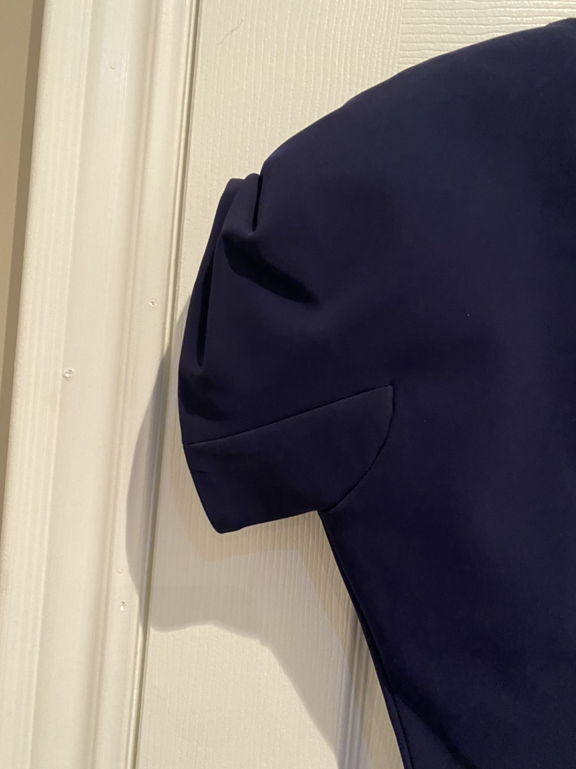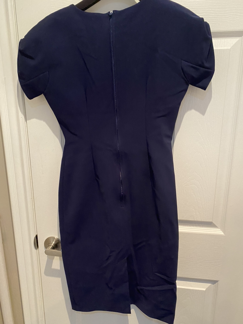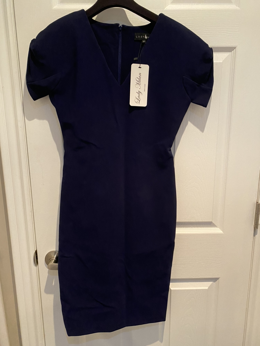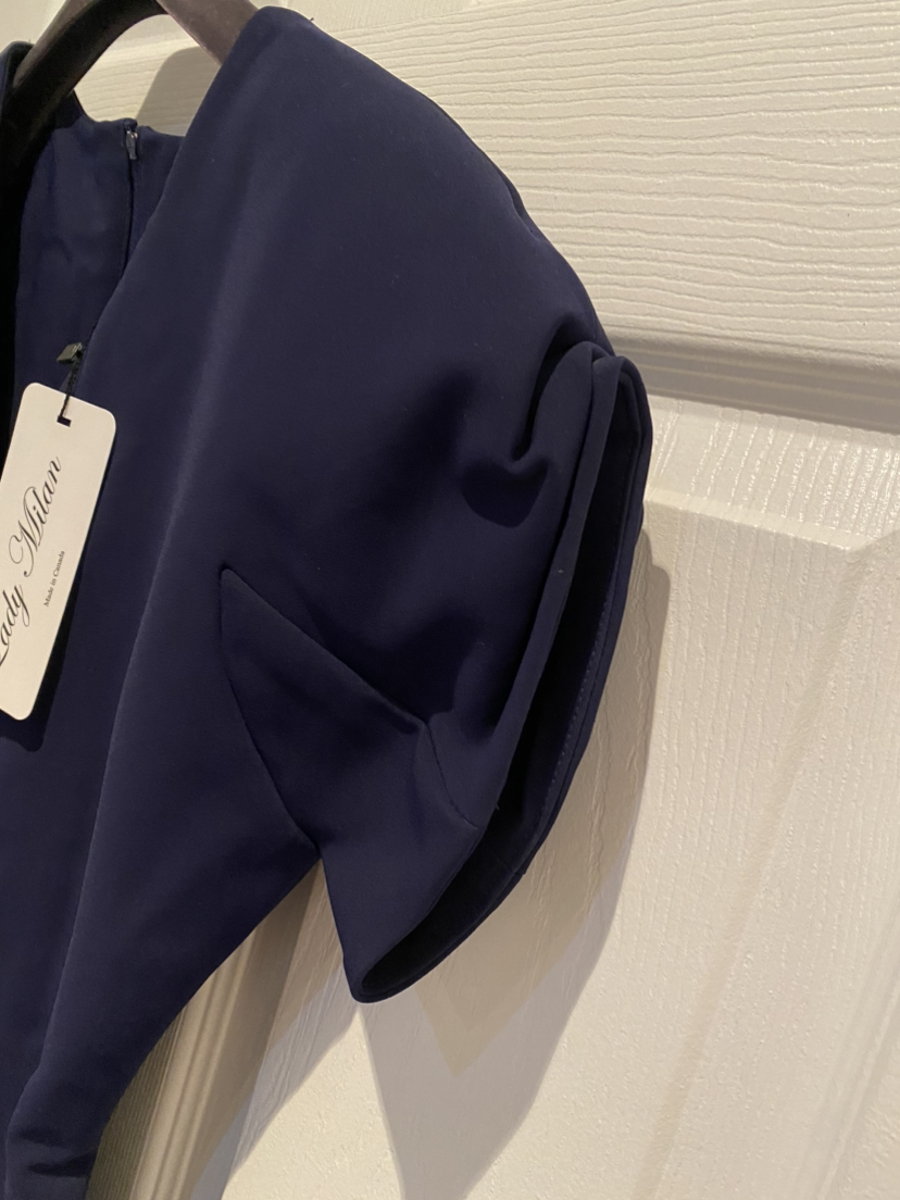 ✅Premium business attire for women. ✅This dress is structured and commands elegance with authority ✅V-neck with capped pleated sleeves and zippered back ✅Fabric Made in Italy ; Dress Made in Canada!