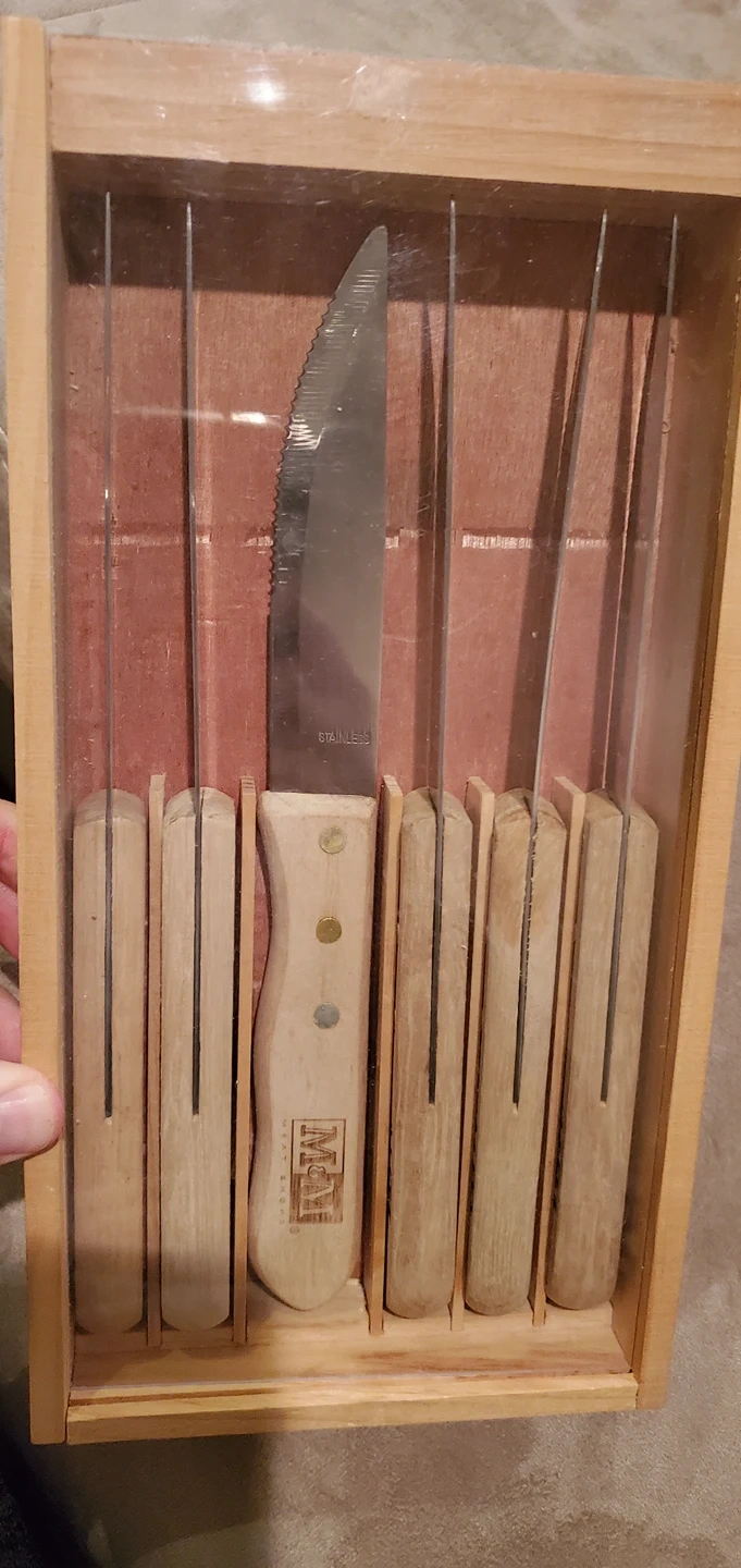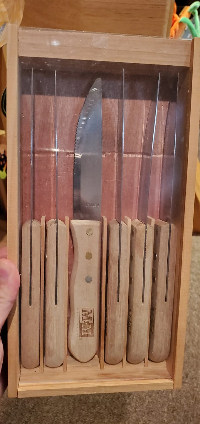brand new never used 6-piece steak knife set. branded with M&M Food Market logo.