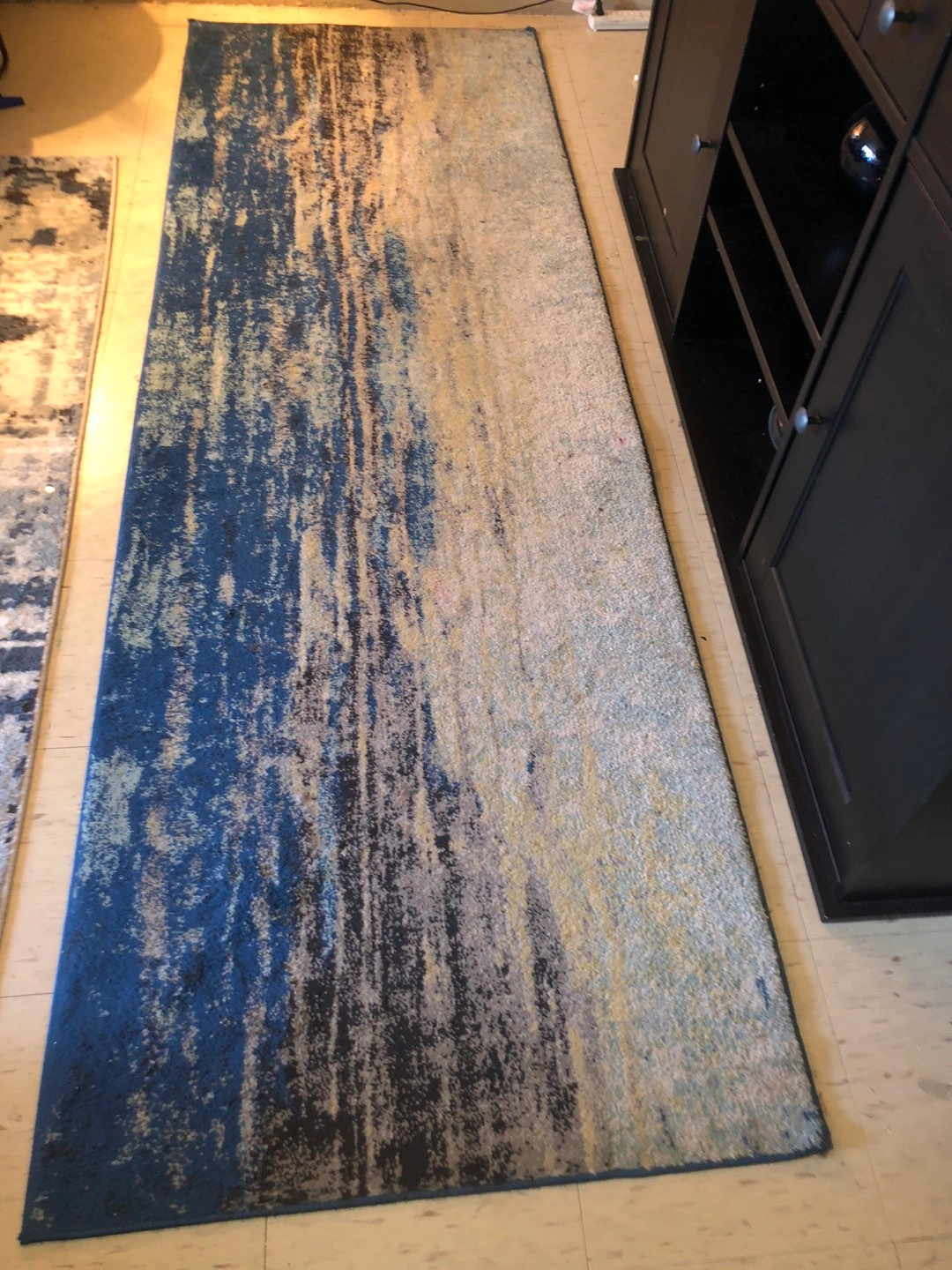 “Trent Austin Abstract Design Runner Everything was purchased from Wayfair Beautiful abstract square carpet with matching runner available very artistic. Carpet and runner Made in Turkey Brand is Bodum Runner 2”x 8”$35.00