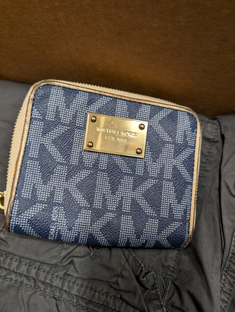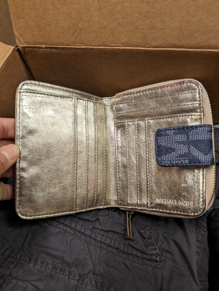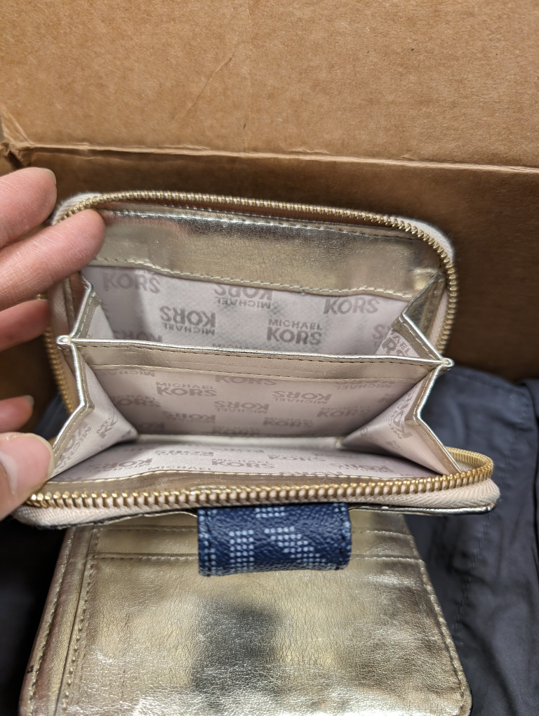 Used but in ok condition. a lot of cards slots and a ton of room for change. There is some wear around the edges