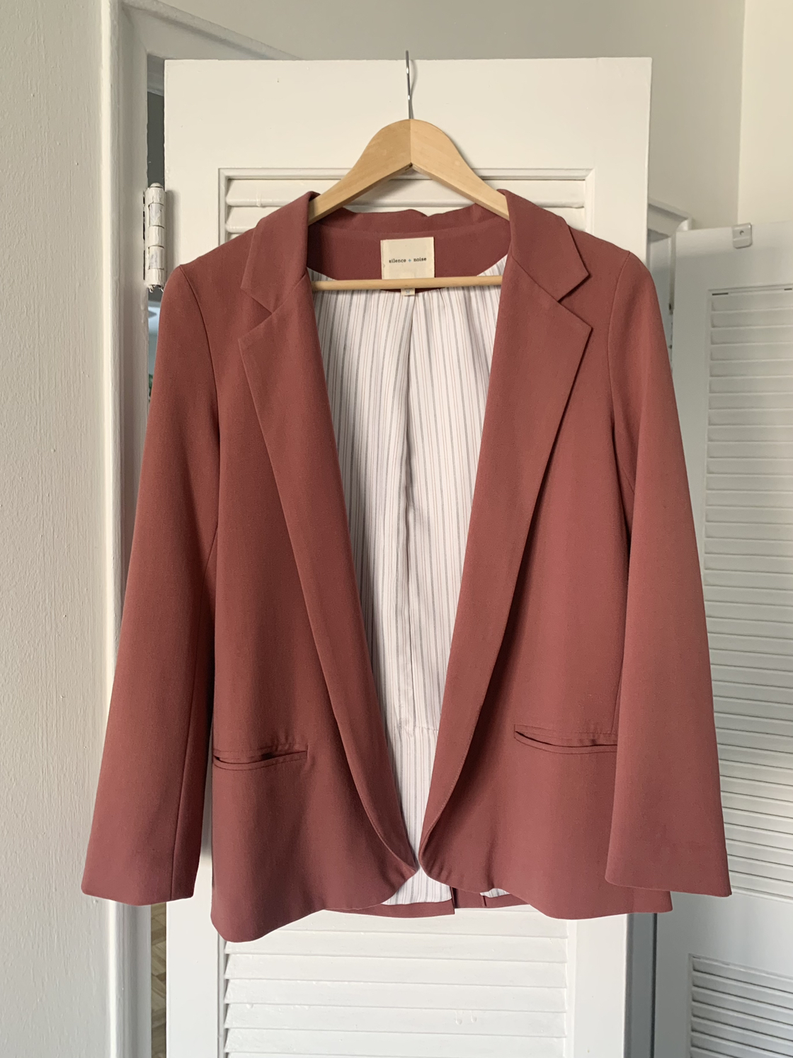 Where soft and chic meet! This dusty rose pink open front blazer has two handy front pockets. Roll the sleeves and show off the complimentary lining for a casual look. Size: Medium Womens Condition: Pre Worn - Great Brand: Silence + Noise Colour: Dusty Rose Pink